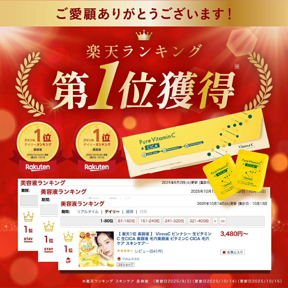 ■15日P10倍&クーポン配布(定期便除く)■【 楽天1位 美容液 】 VinnaC ビンナシー 生ビタミンC 生CICA 美容液 毛穴美容液 ビタミンC CICA 毛穴ケア スキンケア ナイアシンアミド フリー処方 個包装 20包 to esella ビンナC 美白美容液 ピュアビタミンc 美白