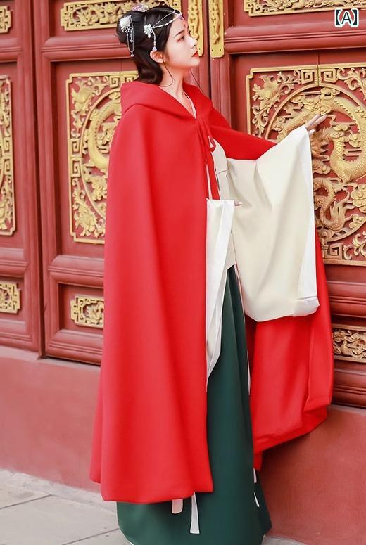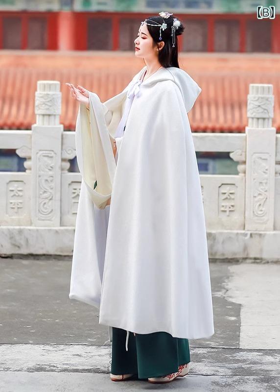 漢服 マント レディース チャイナ風 暖かい レトロ 衣装 フリース 秋冬 ロング丈 フード付き 赤 黒 白 シンプル 無地 裏起毛 コスプレ