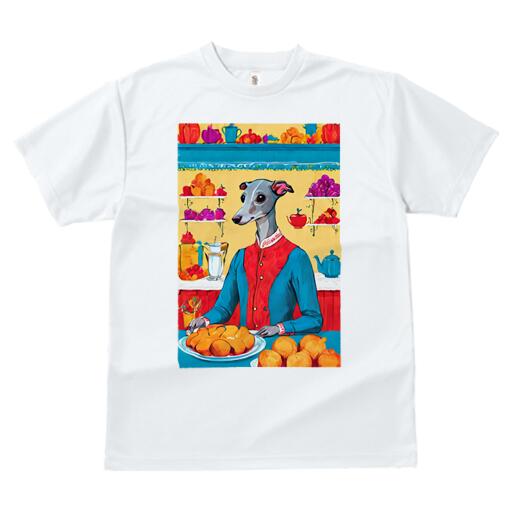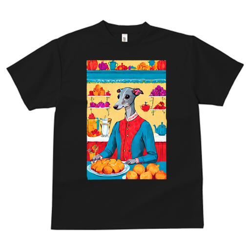イタリアングレーハウンド Tシャツ レディース 犬ファン 半袖 春夏 犬柄 プリント カジュアル かわいい 人間用 個性派 ここだけのデザイン 面白 果物 イタリアングレーハウンド ティーポット 皿 パン