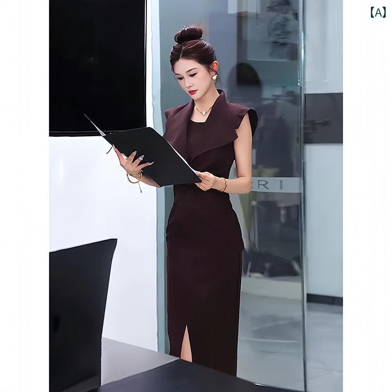 スタイル: オフィス シルエット: Hライン ウエスト: ハイウエスト 柔らかさ: 普通 素材: ポリエステル 袖丈: ノースリーブ スカート丈: ミディ スカートタイプ: Aライン サイズ: S.M.L.XL.2XL カラー: ブラウン 襟元: アシンメトリー 柄: 無地 前開き仕様: ファスナー