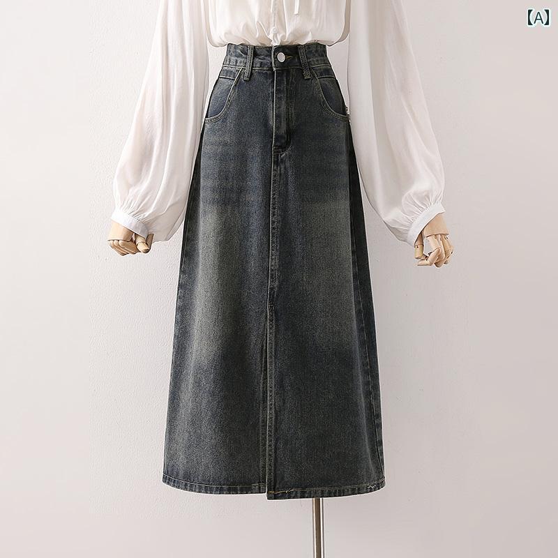 スカート レディース デニム ハイウエスト Aライン ミディ丈 フロントスリット 秋 通勤 カジュアル スタイル