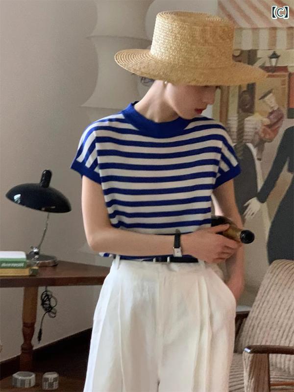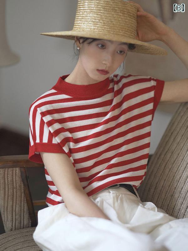 ニット 半袖 レディース 春夏 トップス プルオーバー モックネック ゆったり 薄手 涼しい おしゃれ カジュアル フレンチ マリン ストライプ 白 黒 赤サイズ:SMLXL袖丈:半袖