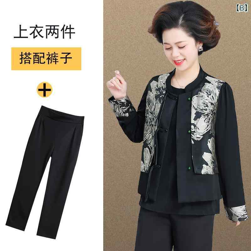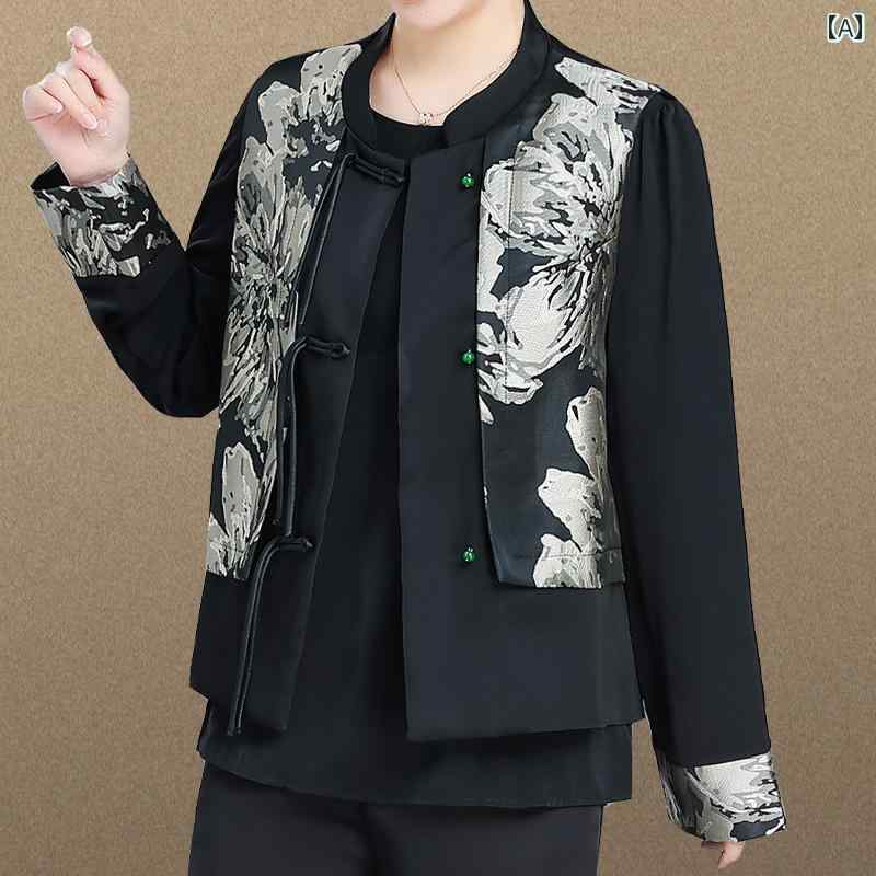 ・カテゴリ: アウター、ジャケット・スタイル: エレガント・主な素材: サテン・ネックライン: ハイネック・袖のタイプ: レギュラー・着丈: ミドル丈 (50-70cm)・柄: 花鳥柄・カラー展開: ブラック・サイズ展開: M, L, XL, 2XL・留め具: シングルボタン・セット内容: 2点セット・着用方法: カーディガン・厚さ: レギュラー・フィット: ルーズ・詳細: ボタン・素材構成: ポリエステル95%、ポリウレタン5%
