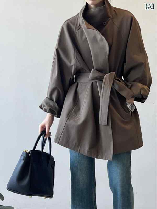 トレンチコート レディース ミドル丈 スタンドカラー 小柄女性 韓国系 日本系 カジュアル アウター 通勤 普段使い ポリエステル素材 ストレートシルエット 長袖 シングルボタン 無地 春秋 カーキ