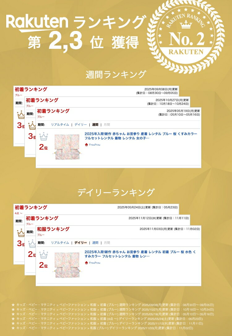 この商品はレンタル品です。販売品ではありません。 ご利用の際は必ず下記のリンク先ページをお読み下さい ◆予約状況をご確認下さい。◆ ※下記期間はご利用いただけません。 (期間の記入が無い場合はご予約可です。) ◆ご予約状況 【2025年】 11/9〜11/15(ご予約済み) 11/16〜11/28(ご予約済み) 11/29〜12/5(ご予約済み) >>同じ柄のピンク色の商品はこちら ※配送先によっては「ご使用日の前日到着」または「ご使用日の当日返却」をお願いさせていただく場合がございます。 予めご了承くださいませ。 --------------------------------------------- ご予約可能な場合でも、ご注文のタイミンングによっては 時間差で予約がうまっている場合もございます。予めご了承ください。 ご注文後、予約の可否をお知らせいたします。 ■楽天システム上、ご予約が埋まっていても、ご注文は出来てしまいますのでご注意ください。 ■ご注文後、予約の可否をメールにてお知らせいたしますのでご安心くださいませ。 ■ご注文のタイミングによってはお時間差で予約不可となる場合もございます。予めご了承ください。 ■メールが届いていない場合は、購入履歴から「ショップへ問合せ」>「問合せ一覧」をご確認ください。 ※基本ご利用日2日前のお届け関連商品2025年入荷!新作 赤ちゃん お宮参り 産着 レンタル 初着 ピンク...お宮参り 着物 レンタル 貸衣装フルフル 高級正絹 産着 レンタル フ...フルセットレンタル 高級正絹 着物レンタル 黒留袖レンタル 結婚式 母...8,800円8,800円8,800円2024年入荷!新作 赤ちゃんお宮参り 産着 レンタル くすみカラー ...レンタル お宮参り 着物 高級正絹 産着 初着 レンタル フルセットレ...2025年入荷!新作 赤ちゃん お宮参り 産着 レンタル くすみカラー...9,800円9,800円10,800円【2025年9月新入荷!】新作 お宮参り 着物 レンタル 貸衣装フルフ...【2025年9月新入荷!】新作 お宮参り 着物 レンタル 貸衣装フルフ...【正絹 着物レンタル】お宮参り 着物 レンタル 貸衣装フルフル赤ちゃん...10,800円10,800円13,800円フルセットレンタル 高級正絹 着物レンタル 黒留袖レンタル 結婚式 母...お宮参り 着物 レンタル 貸衣装フルフル 高級正絹 産着 レンタル フ...お宮参り 着物 レンタル 貸衣装フルフル 高級正絹 産着 レンタル フ...9,800円9,800円9,800円【お宮参り着物】初着(産着) くすみブルー三色さくら ※商品の色については画面を表示するモニターによって実際と多少異なる場合がございます。ご了承下さいませ。 [お宮参り初着(産着)うぶぎ] ■素材:合成繊維 商品説明:くすみカラーの薄いブルー地に三色の桜がメインの柄で、かのこ柄のさくらがカワイイ初着です。 初着(産着)衣裳などについて詳しくは Frou Frou まで 電話又はメールにてお気軽にお問合せ下さい。 ■0532-39-7660 お参り日は産後で男子は31日〜32日、女子は32日〜33日が良いとされています。地方によっては異なる場合もございますので30日前後でのお参りが一般的です。季節や天候、母子の体調によって調節されるとよろしいかと思います。 ◆レンタル内容【4点セット】 1.着物、2.よどかけ、3.帽子、4.お守り ベビー帽子セット無料レンタル付!(よだれかけ、帽子、お守り) ▼予約状況は下記でご確認下さい。