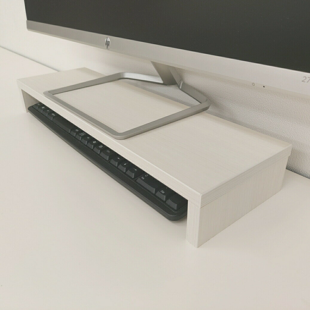 作業スペースがもっと欲しい!!机が狭い!!作業が出来る十分なスペースが欲しい?テレワークなどでそんなお悩みありませんか?イイものを長く使ってほしいから納得していただける高品質商品を提案。パソコンとキーボードを効率的に、オシャレに収納出来るシンプルスリム・モニター台。カラーはホワイトハート柄とグレイエルム柄を使用1.ホワイトハート船舶、車両用等に使われる木材で、耐久性に富んだ優しい木目が印象的2.グレイエルムヨーロピアンウォールナット柄で重厚でありながらダイナミックな木目が美しい高級柄の人気の2色をチョイス。◯素材 面材は紙ではなく高機能なEB(電子線硬化)オレフィンシートを標準装備。 フローリングの床材等にも使用されるEB技術は、高い傷への耐候性と質感で高機能建築材料の主流となっています。 優れた表面性能を兼ね備えた(EBオレフィンシート)だからこそ、汚れや傷に強い!(EBオレフィンシート)を使うことで、・〈耐汚染性〉油性マジックでも洗剤(当社ピカット)でらくらく汚れ落とし可能!!・〈耐溶剤性〉 アルコール、石油ベンジンなどの溶剤にも強いシート素材!・〈耐擦傷性〉 耐擦傷性にすぐれ、傷がつきにくい。スチールウール試験 20回でも表面素材変化なし!!・〈耐日射性〉連続日射耐候試験合格!日焼けしにくい!EBとは、電子の束である電子線(Electron Beam)のこと。一瞬で強固な塗膜を形成するので、より少ないエネルギーで製造が可能。地球にもやさしいテクノロジーです。◯デザイン 高意匠性面材仕様(NG社製オレフィンシート)で木目柄が生み出すリラックス効果をキャビネットにプラス。・〈カラー〉安心感を与える落ち着いた色のホワイトウォールナットカラー。・〈木目柄〉 流行の大柄木目のデザイン。木目調ならでの凹凸を表現、「暖かく」「なめらかな」手触り。・〈表面材〉 他にはない本格的木目仕様シート。シート特有のツヤを抑えたマットな仕上がり。傷が目立ちにくい!・〈感触〉木目を極限まで再現した凹凸感のある3Dシートを使用。・ギリギリサイズを狙ったスリムでシンプルな外観◯機能・〈木目調〉シンプル且つオシャレな木目柄だからどんなシーンにもナチュラルに溶け込むデザイン・〈利便性〉高機能化した表面材を使っているから汚れや傷に強い!・〈隙間活用術〉キーボードに合わせて設計して4種類の異なるサイズを用意しているからいるからサイズに関する心配は御無用!○安心の国産日本製・製品はものづくり刃物の町、岐阜県関市のトマト工業株式会社製・ロボットや3DCADAMなど最新鋭設備の揃った工場で一つづつ丁寧に製作されています。◯サイズ〈商品名〉 〈サイズ〉 1505W 奥行150×幅500×H65 (mm)空間高さ(約50mm)空間幅(468mm) 1510W 奥行150×幅500×H115(mm)空間高さ(約100mm)空間幅(468mm) 2005W 奥行200×幅500×H65 (mm)空間高さ(約50mm)空間幅(468mm) 2010W 奥行200×幅500×H115(mm)空間高さ(約100mm)空間幅(468mm)