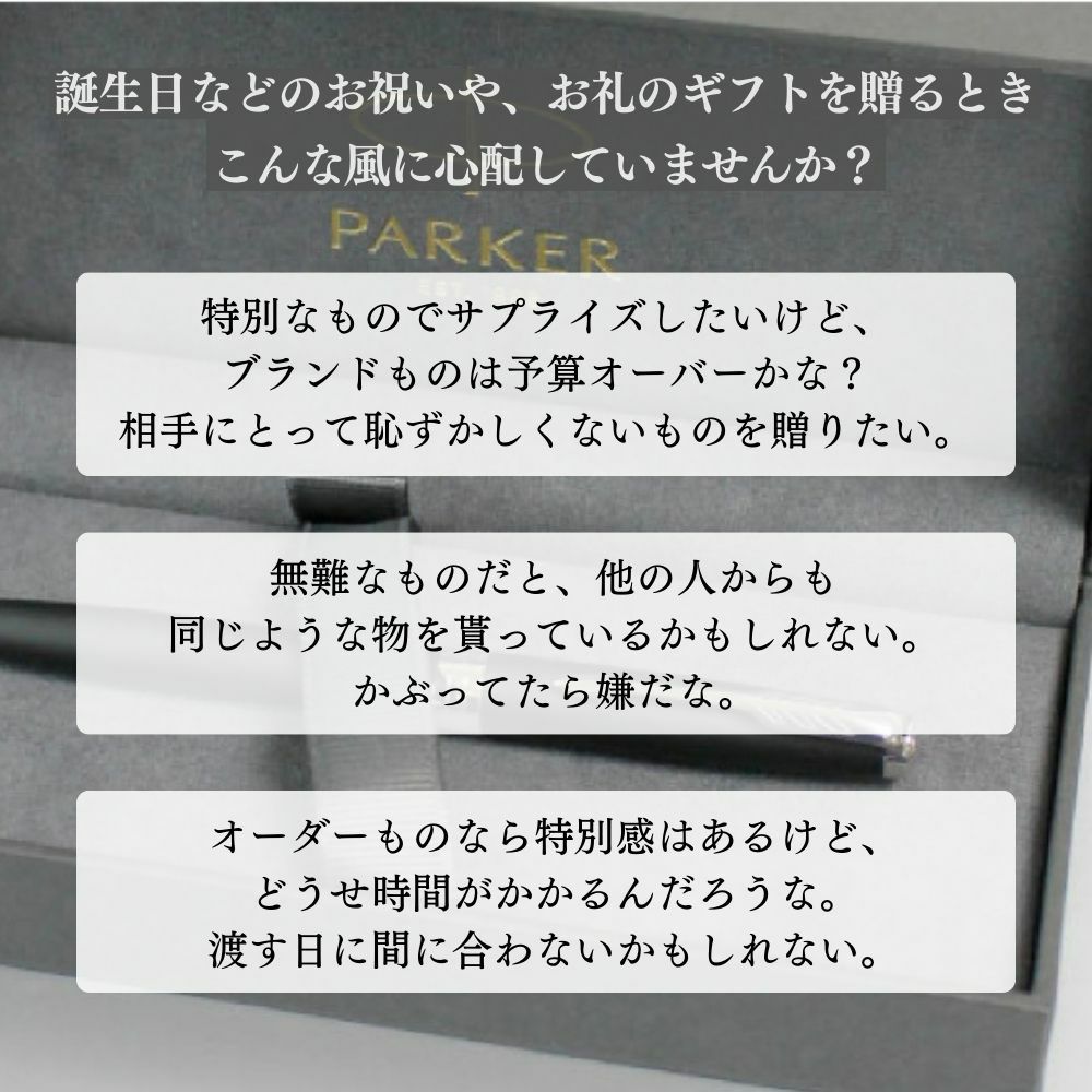 上質で洗練されたスタイルの「ソネット」は、パーカーの優美さのシンボルです。 優雅でバランスのとれたスタイル、手に馴染む心地よい大きさ、控えめながら完璧であること。 時代を超えて多くの人に愛される美しさと機能性を兼ね備えた「ソネット」はパーカーが誇りを持っておすすめする逸品です。 軽量なので、携行に向いています。男女問わず人気の品です。 パーカー PARKER ソネット SONNET サイズ 138mmx8mm ツイスト繰出し式 重さ 28g カラー ブラック 黒 金 銀 ゴールド シルバー 赤 レッド エンジ ブルー 青 紺 素材 真鍮 黄銅 ブラス 英数のみ書体をご指定で「・(中黒)」を入力の場合、 自動的に「.(ピリオド)」に置き換わります。 「・」をそのまま彫刻希望の場合は、かな漢字対応書体をお選び下さい メーカーのラッピング用紙は予告なく変更に成る場合がございます。 ☆ギフト商品はお届け日指定をお願い致します☆ ※配達日時指定はご購入手続きの中で指定出来ます。 当日配送は遅れが生じる場合もございますので、 ご注意して指定日設定お願い致します。 ※不正購入と判断した場合にはご注文を取り消しさせて頂く可能性がございます。 【こんなときにオススメ】 下記を控えた親御様、お子様、 またはプレゼントとしてオススメです! 入園 入学 保育園 幼稚園 小学校 準備 出産祝い 入園祝い 入学祝い また、社会人の方への贈り物としても 大変好評いただいております! 栄転 転勤 退職 入社 卒業 昇格 出世 部署変え 配置変え 改装 上司 父親 兄弟 恋人 彼氏 彼女 夫 カップルへのお祝いとしても大変喜ばれます! 結婚 成婚 妊娠 出産 新築 恋人 バレンタイン 記念日 クリスマス 出会った記念 【こんなときにオススメ】 下記のシーンにお使い頂いております! 内祝い 出産祝い 誕生日 景品 快気祝い 新築祝い 卒団記念 卒業記念 謝恩会 入学記念 子どもの日 母の日 父の日 お中元 敬老の日 お歳暮 クリスマス プレゼント ゴルフコンペ ホールインワン ノベルティ キャンペーン 引き出物 賞品 景品 バースデー祝い お誕生日祝い 出産祝い 結婚祝い 引越し祝い 初節句祝い 七五三祝い ホワイトデー 入園祝い 入学祝い 進級祝い 進学祝い 入学祝い 卒業祝い 就職祝い 入社祝い 退職祝い 還暦祝い 敬老祝い 長寿祝い 成人の日 バレンタインデー 結婚 成婚 妊娠 出産 新築 恋人 バレンタイン 記念日 クリスマス 入園 入学 保育園 幼稚園 小学校 準備 出産祝い 入園祝い 入学祝い 栄転 転勤 退職 入社 卒業 昇格 出世 部署変え 配置変え 改装 贈り物 餞別 【こんなデザインをお探しの方に】 シンプル 大人 高級 高級感 おしゃれ オシャレ モダン 都会的 豪華 【特急名入れギフトSYMPLで取り扱いのあるブランド】 CROSS クロス PARKER パーカー SWAROVSKI スワロフスキー 【下記のようなサービスもおつけしてます!】 名入れ ネーム入り 名前入り ギフト包装 即納 土日 配送