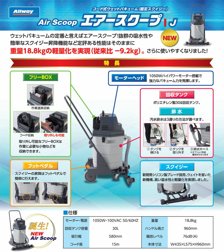 こちらの商品は梱包運送の都合上【未組立て】にて発送させて頂きます。 お手数ではございますが商品到着後、お客様にて組み立てをお願いします。(簡単な工具で出来ます。) また、メーカー倉庫より直接出荷お届けとなりますのでご了承ください。 ウエットバキュームの定番と言えばエアースクープ! 抜群の吸水性や簡単なスクイジー昇降機能など定評ある性能はそのままに重量18.8kgの軽量化を実現(従来比−9.2kg)さらに使いやすくなりました。 電源:1,050W 100V 50/60Hz 電源コード:15m 大きさ:W435×L575×H960mm 質量:18.8kg スクイジー幅:580mm タンク容量:30L 騒音レベル:76dB(A)