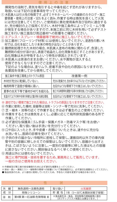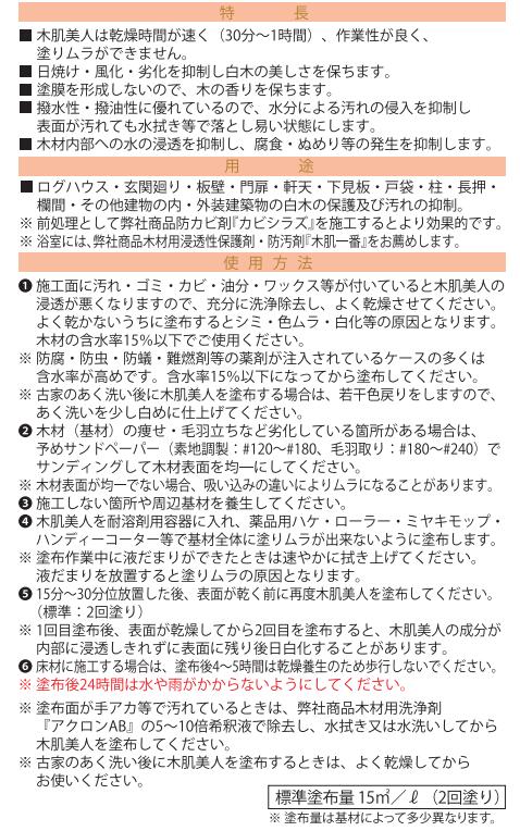 【主な用途】 ログハウス・玄関廻り・板壁・門扉・軒天・下見板・戸袋・柱・長押・欄間・その他建物の内・外装建築物の白木の保護及び汚れの抑制 【製品特徴】 ・木肌美人は乾燥時間が速く(30分~1時間)、作業性が良く、塗りムラができません。 ・日焼け・風化・劣化を抑制し白木の美しさを保ちます。 ・塗膜を形成しないので、木の香りを保ちます。 ・撥水性・撥油性に優れているので、水分による汚れの侵入を抑制し表面が汚れても水拭きなどで落とし易い状態にします。 ・木材内部への水の浸透を抑制し、腐食・ぬめり等の発生を抑制します。 ※使用する際は画像注意事項またはミヤキ公式ホームページSDSをご覧になってからご使用ください。
