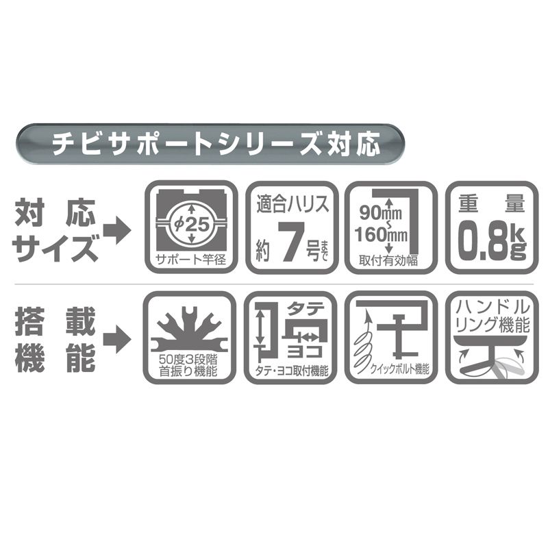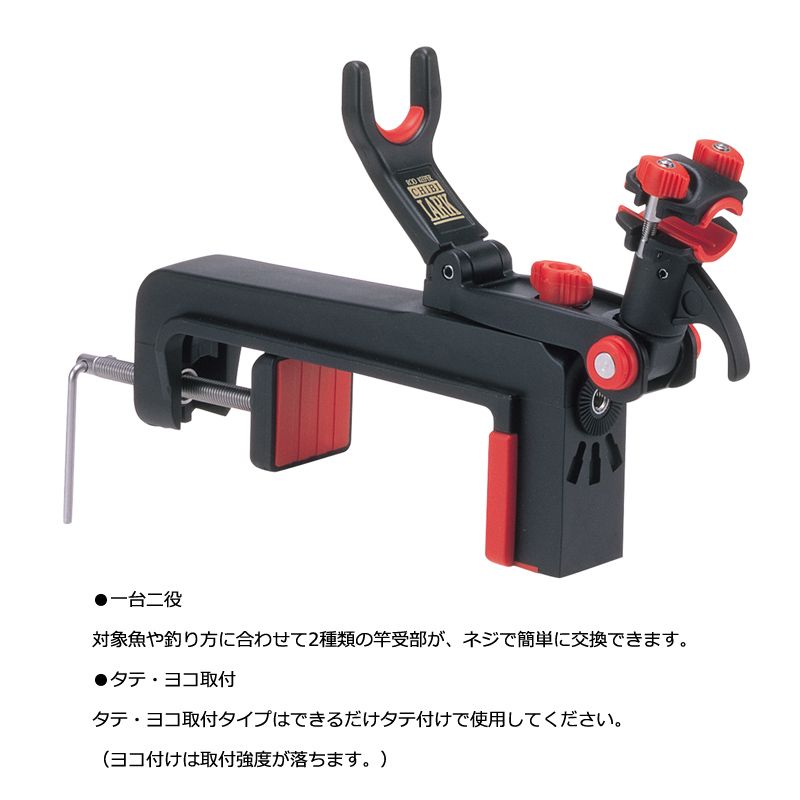 仕様表替え竿受が付いた一台二役のラーク竿受シリーズ最小・再軽量のチビラークの取付幅を16cmにアップしたワイドバージョン。対象魚や釣り方に合わせて2種類の竿受部が、ネジで簡単に交換できます。船べりを上下のノンスリップゴムでガッチリ挟み込むので左右のひねりにも安定度抜群。また船べりの取付がグ〜ンと速くなったクイックボルト、タテ・ヨコ取付、首振り、ハンドルリングなど基本的な機能が満載です。【一台二役 タテ・ヨコ取付】●一台二役対象魚や釣り方に合わせて2種類の竿受部が、ネジで簡単に交換できます。●タテ・ヨコ取付タテ・ヨコ取付タイプはできるだけタテ付けで使用してください。(ヨコ付けは取付強度が落ちます。)【首振り ハンドルリング】●首振り潮の流れに合わせて、竿受部は50度、3段階に調節できます。これなら狭い場所でもオマツリを避ける方向へ自在に対応できます。●ハンドルリングクランプネジのL型ハンドルに取り付け、クランプネジを指先でクルクル回せるので船べりへの脱着がスピーディーになります。【添木】●添木添木を船べりの上側にセットすると腰の高さでロッドやリールをラクラク操作できます。【SPEC】◆ラーク竿受[取付有効幅]90〜160mm[適合ハリス(幹糸)]約7号まで[サポート竿径取付サイズ]φ25まで[本体・クランプ部]アモルファス樹脂[収納サイズ]130x285x52mm[重量]870g[付属品]・細竿径用アダプターSS・S:添木(105x80x58mm)◆受太郎DX竿受[収納サイズ]135x305x54mm[重量]810gMADE IN JAPAN詳細はこちら