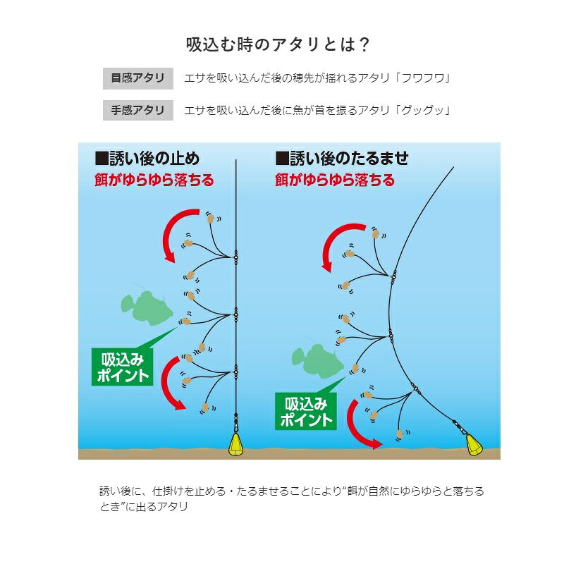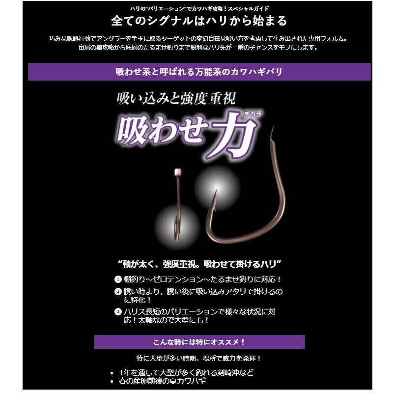 仕様表大型魚に適した高活性仕掛け。太軸で快適なやり取りが可能。ハリの「バリエーション」でカワハギ攻略!スペシャルガイド全てのシグナルはハリから始まる巧みな就餌行動でアングラーを手玉に取るターゲットの変幻自在な喰い方を考慮して生み出された専用フォルム。宙層の棚攻略から底層のたるませ釣りまで鋭利なハリ先が一瞬のチャンスをモノにします。■吸わせ系と呼ばれる万能系のカワハギバリ「軸が太く、強度重視。吸わせて掛けるハリ」1.棚釣り〜ゼロテンション〜たるませ釣りに対応!2.誘い時より、誘い後に吸い込みアタリで掛けるのに特化!3.ハリス長短のバリエーションで様々な状況に対応!太軸なので大型にも!■こんな時には特にオススメ!特に大型が多い時期、場所で威力を発揮!・1年を通して大型が多く釣れる剣崎沖など・春の産卵前後の夏カワハギ■吸込む時のアタリとは?・目感アタリエサを吸い込んだ後の穂先が揺れるアタリ「フワフワ」・手感アタリエサを吸い込んだ後に魚が首を振るアタリ「グッグッ」■FF フッ素フィニッシュフック表面をフッ素コーティング。フッキング後の滑り性が向上しスムーズにカエシまで刺さります。■吸い込みやすいコンパクト設計はそのままに、太軸化することで、強度UP(当社・吸わせ比較)■鈎先ストレート形状で、力がしっかり伝わりしっかり掛けられる■カワハギを寄せやすい、ハリス止め間隔を採用。ワイド間隔幹糸(別売り)を使用すれば、より広範囲を探れます■カワハギへのアピール力のある集寄ビーズをハリス止め両端に配置。ハリス止めの結束部には、遊びができにくい添糸式を採用■膜厚を抑えたフッ素フィニッシュを施し、滑らかな刺さりを追求■エサをホールドしやすい形状SHIMANOシマノ カワハギ仕掛け 楽々セット 吸わせ力 (チカラ)●品番:RG-KE1Q●セット内容:仕掛け2組●鈎(号):7.5●ハリス(号):2.5●幹糸(号):3●全長(cm):67●枝長さ(cm):6●素材:ハリ/鋼 ハリス/フロロカーボン 幹糸/フロロカーボン詳細はこちら