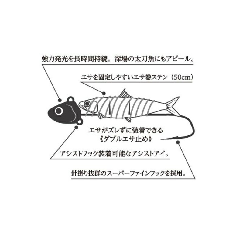 仕様表猛烈発光で太刀魚にアピール。夜光にこだわった波止用太刀魚テンヤ。2本の針で太刀魚のバラシを低減。■猛烈発光業界TOPクラスの輝度を持つ夜光塗料を採用、長時間強力発光を実現。■Wエサ止めエサのキビナゴやドジョウを固定しやすいWエサ止め採用。■Wフック僅かなアタリでもしっかりと掛ける細軸ダブルフックYAMASHITAヤマシタ 猛光 太刀魚テンヤ ダブル L●重さ:6号(約22.5g)●全長:114mm※全長は、ヘッドの先端から針の後端まで。詳細はこちら
