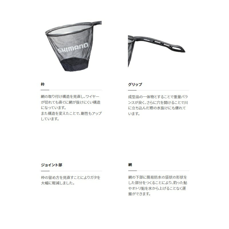 仕様表鮎を弱らせずにポイント移動をするのに欠かせない小河川の定番「袋ダモ」底部に簡易防水の袋状の構造を有する定番の袋タモです。枠やグリップジョイントはBASIS譲りの構造を採用。引き舟を外してポイントを移動する必要がある、日本の小河川や上流域での友釣りで活躍します。●枠 網の取り付け構造を見直し、ワイヤーが切れても直ぐに網が抜けにくい構造になっています。 また構造を変えたことで、剛性もアップしています。●グリップ 成型品の一体物とすることで重量バランスが良く、さらに穴を開けることで川に立ち込んだ際の水抜けにも優れています。●ジョイント部 枠の留め方を見直すことによりガタを大幅に軽減しました。●網 網の下部に簡易防水の袋状の形状をした部分をつくることにより、 釣った鮎やオトリ鮎を水から上げることなく運搬ができます。SHIMANOシマノ 鮎袋ダモZ●品番:PD-1H1V●カラー:ブラック●サイズ:39cm詳細はこちら