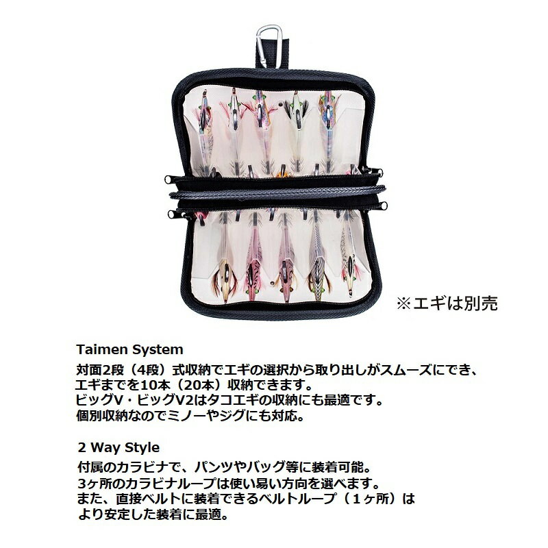 仕様表三角形の個別対面収納でスペースの無駄が無く、エギをコンパクトに収納できます。半透明ケースでカラーやサイズが一目瞭然。カラビナとベルトループ付属でパンツやバッグ等に装着可能なエギケースです。Taimen System対面2段(4段)式収納でエギの選択から取り出しがスムーズにでき、エギまでを10本(20本)収納できます。ビッグV・ビッグV2はタコエギの収納にも最適です。個別収納なのでミノーやジグにも対応。2 Way Style付属のカラビナで、パンツやバッグ等に装着可能。3ヶ所のカラビナループは使い易い方向を選べます。また、直接ベルトに装着できるベルトループ(1ヶ所)はより安定した装着に最適。DAIICHISEIKO第一精工 エギラック ミニV●SIZE:205×145×30mm●10本収納タイプ●3号エギ(全長120mm)まで収納可能詳細はこちら