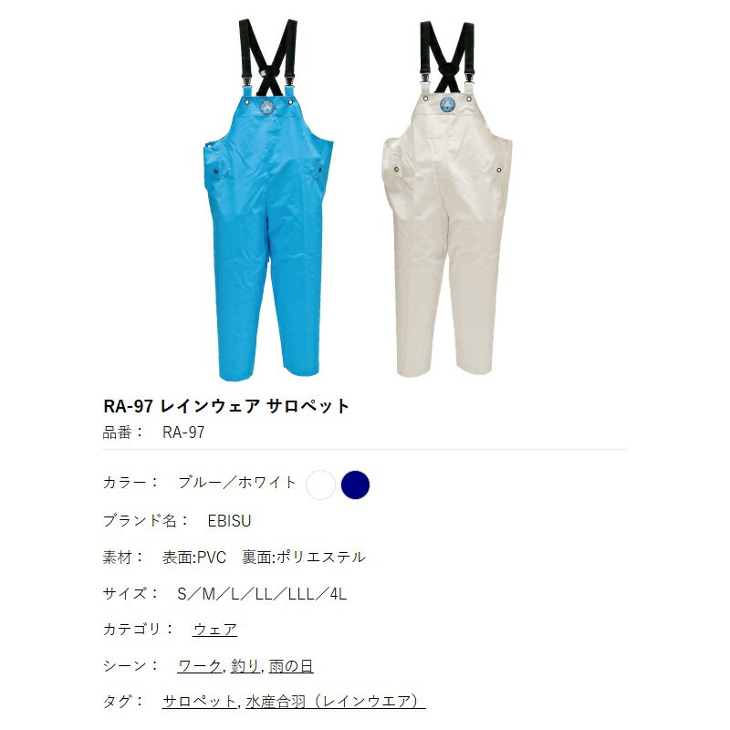 仕様表ヒザ部二重構造により強度を補強。作業性の良いサイドマチ付。取り外し式肩ベルト仕様。肩ベルトの替え・ウエストベルトとして使えるゴムベルト付。生地総厚約0.4mmHanshinkiji RA-97阪神素地 RA-97 レインウェア サロペット●品 番:RA-97●カラー:ホワイト●サイズ:M●適応身長:162-168cm●胸 囲:84-92cm●胴 囲:72-82cm●股 下:65.5cm●素 材:表面:PVC 裏面:ポリエステル※サイズは実寸の表示ではなく目安です。詳細はこちら