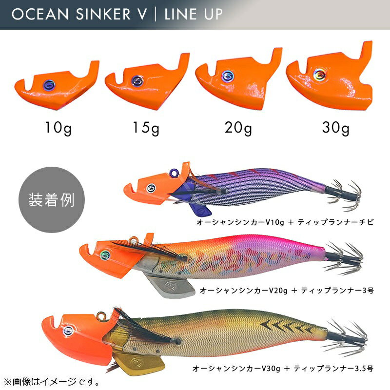 仕様表強風や深場など ハードコンディション下におけるティップランエギングで、ノーマルセッティングでは攻略できない状況を打破する為の必須アイテム。各種メーカーのティップランエギに幅広く装着可能。装着時にエギの姿勢を崩さないウェイトバランス設計(ティップランナー装着時)お試しシンカーストッパーバンド付き。■Vロックシステム採用ストッパーバンドでしっかりと固定できる『V固定方式』を採用。■ボディ形状を一新水切れが良くシャクリが軽い薄型形状。■適応機種ティップランナースクイッドシーカー 23g・30g(※)ダートマックスTR 30g・40gエギ王Q TR 3.5号エメラルダスボート2/3号25g・3.5号30gドラッギン番長 30g※上記に記載があるものでも、個体差により装着不可な場合がございます。crazy ocean ocean sinkerクレイジーオーシャン オーシャンシンカーV●カラー:オレンジ●入数:2●品番:OSV-30●サイズ:30g詳細はこちら