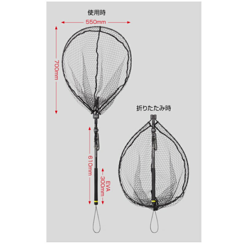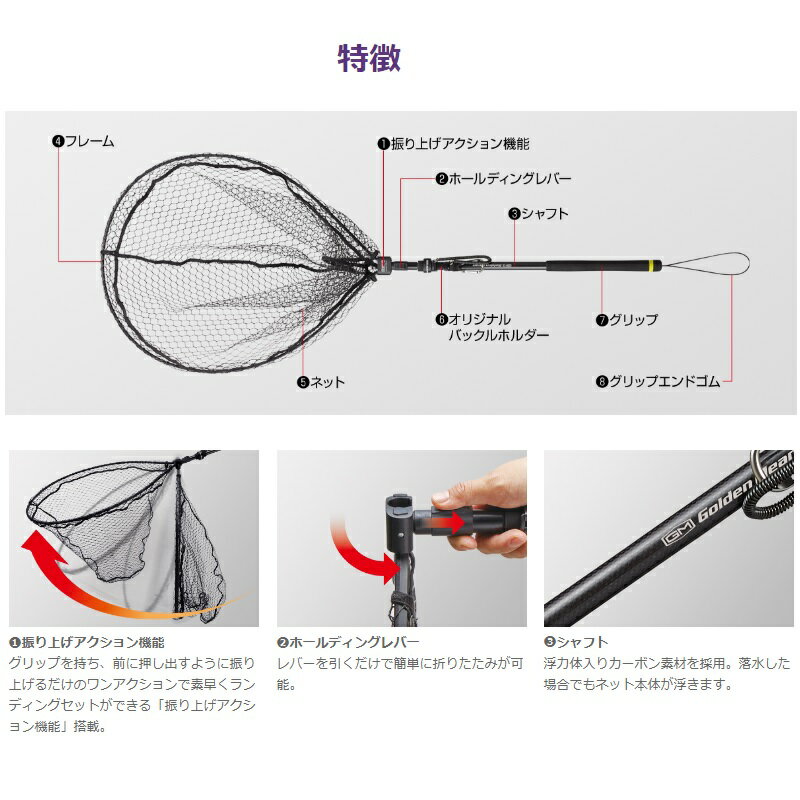 仕様表従来のガンナーネットから、取り回し、使用感を向上させた「GM・ガンナーネット プロ」。新形状の「軽量強化アルミフレーム」+「大型ピッチ組糸ラバーコートネット」にネットが落水しても沈まず浮かぶ「浮力体入りカーボンシャフト」を採用。さらに、ワンアクションで素早くランディングセットができる「振り上げアクション機能」により、急なターゲットとのやり取りもストレスなく対応できます。<特徴>(1)振り上げアクション機能グリップを持ち、前に押し出すように振り上げるだけのワンアクションで素早くランディングセットができる「振り上げアクション機能」搭載。(2)ホールディングレバーレバーを引くだけで簡単に折りたたみが可能。(3)シャフト浮力体入りカーボン素材を採用。落水した場合でもネット本体が浮きます。(4)フレーム新形状の軽量強化アルミ採用。(5)ネット20mmの大型ピッチ組糸ラバーコートネットを採用。軽量化はもちろん、水切れが良く、針絡みも軽減します。(6)オリジナルバックルホルダーオリジナルバックルホルダーを装着。カラビナを取り外さなくてもワンプッシュでネットを脱着できます。(落下防止スパイラルロープ付き)(7)グリップオリジナル形状の軽量EVAを採用。グリップエンドには視認性を高めたイエローカラーを採用。(8)グリップエンドゴム使用時に手首に巻き込むことで落下を防止します。Golden Mean Gunner Net Proゴールデンミーン ガンナーネット PRO●カラー:ブラック●ネット素材:ラバーコートネット(深さ600mm)●自重:565g●ネットフレームサイズ:H700×W550mm●シャフト長:610mm詳細はこちら