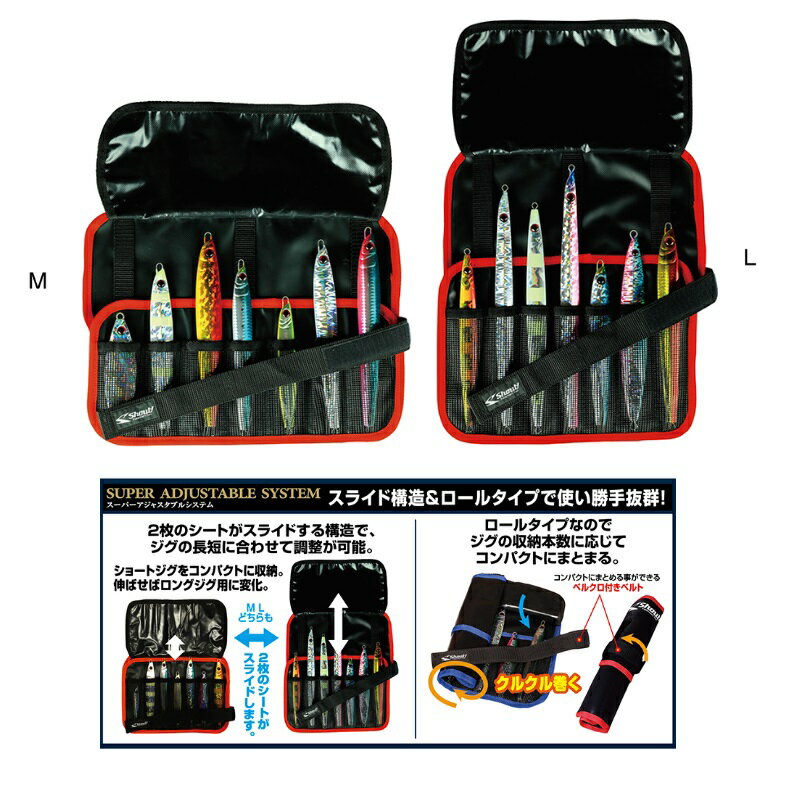 仕様表ジグの長さや本数に合わせて調節可能なロールジグバッグ。2枚のシートがスライドする構造でジグの長短に合わせてサイズ変更が可能。ショートジグをコンパクトに収納でき、シートを伸ばせばロングジグ用にも変化する。くるくる巻けるロールタイプ。ベルクロ付ベルトで全体をまとめられるので、ジグの収納本数に応じて全体がコンパクトになり、かさばらない。Shoutシャウト アジャスタブルロールジグバッグ●品番:543AM●カラー:レッド●タイプ:M●収納最大ジグ長寸:22cm詳細はこちら