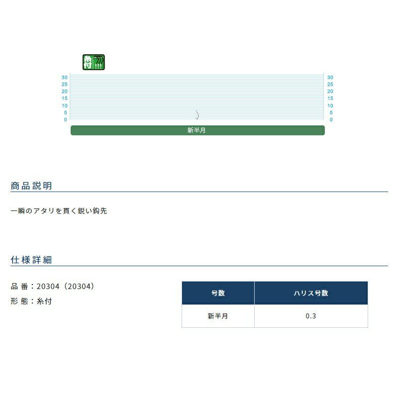 仕様表一瞬のアタリを貫く鋭い鈎先OWNERオーナー OH タナゴ 新半月●品番:20304(20304)●形態:糸付●号数:新半月●ハリス号数:0.3詳細はこちら