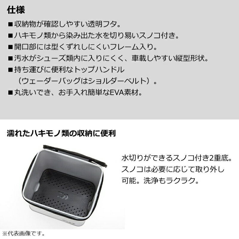 仕様表■シューズ、ブーツの「運搬・保管に最適」●収納物が確認しやすい「透明フタ」●ハキモノ類から染み出た水を切り易い「スノコ付き」●開口部には型くずれしにくいフレーム入り。●汚水がシューズ類内に入りにくく、車載しやすい縦型形状。●持ち運びに便利なトップハンドル(ウェーダーバッグはショルダーベルト)●丸洗いでき、お手入れ簡単なEVA素材。■濡れたハキモノ類の収納に便利水切りができるスノコ付き2重底。スノコは必要に応じて取り外し可能。洗浄もラクラクDAIWA SHOES BAG(K)ダイワ シューズバッグ(K)●本体外寸(cm):約28×34×29●素材:EVA●カラー:ブラック詳細はこちら