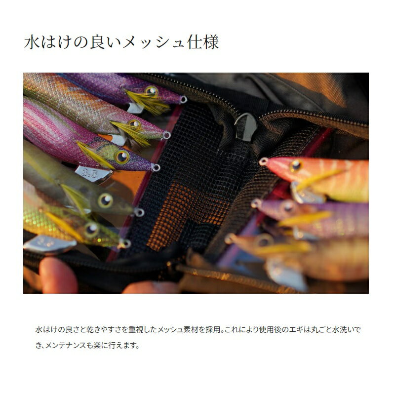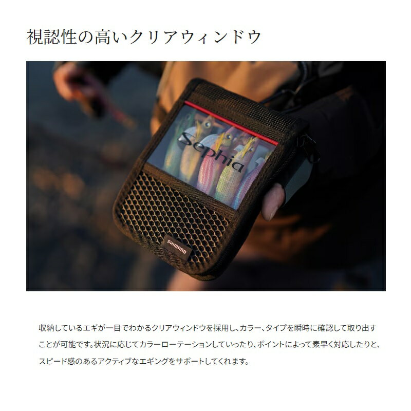 仕様表エギが良く見える、乾きやすいホルダークリアウィンドウを採用し、取り出したいエギをすぐ確認することが可能。また、使用後は丸洗いしてもメッシュ素材で乾きが早いのでメンテナンスしやすくなっています。【KEY FEATURE】■視認性の高いクリアウィンドウ収納しているエギが一目でわかるクリアウィンドウを採用し、カラー、タイプを瞬時に確認して取り出すことが可能です。状況に応じてカラーローテーションしていったり、ポイントによって素早く対応したりと、スピード感のあるアクティブなエギングをサポートしてくれます。■水はけの良いメッシュ仕様水はけの良さと乾きやすさを重視したメッシュ素材を採用。これにより使用後のエギは丸ごと水洗いでき、メンテナンスも楽に行えます。■選べる3サイズ。Sはカラビナを標準装備サイズ展開はL、R、Sの3種類。各自のスタイルによって選べるサイズ展開となっています。なお、3.5号のエギに換算した収納目安はLが18本、Rが14本、Sが8本。Sサイズはカラビナを標準装備しているため、バッグ等に外付けして使用することも可能。頻繁に使用するエギを、より素早く取り出すことができます。SHIMANOシマノ セフィア ドライメッシュホルダー●品番:BP-222W●カラー:ブラック●サイズ:S●本体寸:4.5×13×18cm●収納目安:3.5号のエギ8本詳細はこちら