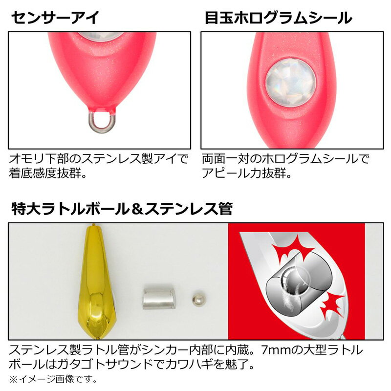 仕様表音でアピール!特大ラトルボール入りシンカー1.特大ラトルボール&ステンレス管・音でアピール!ラトル音量大幅UP! ステンレス製ラトル管がシンカー内部に内蔵。 7mm大型ラトルボールはガタゴトサウンドでカワハギを魅了する。2.センサーアイ・オモリ下部のステンレス製アイで着底感度抜群!3.目玉ホログラムシール・両面一対のホログラムシールでアピール力抜群!DAIWA KAWAHAGI FUNE SINKER SRVダイワ カワハギ船シンカーSRV●号数:25●カラー:フルゴールド詳細はこちら