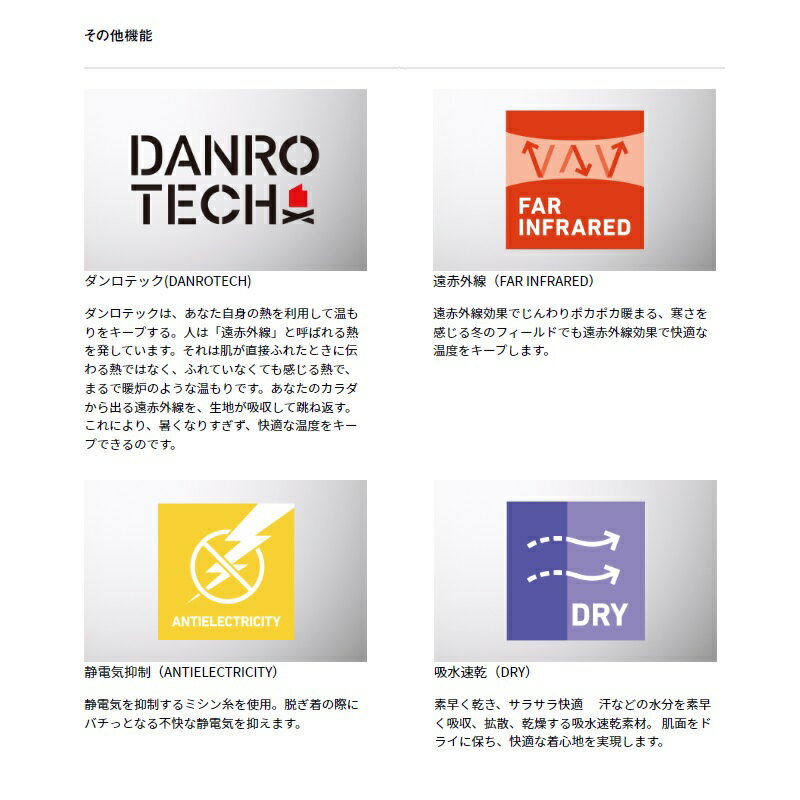 仕様表袖口撥水のダンロテックアンダーシャツ身体から出る遠赤外線を生地が吸収して跳ね返すことにより、日中や朝晩の気温の変化があっても快適な温度をキープするアンダーウェア。全身を包み込むようにふんわり柔らかく、暖かい生地で、常に快適な衣服内環境を整えるよう開発。裏側には汗冷え防止の疎水性(水分を含まない)のポリプロピレン素材を織り交ぜることで冬場の汗冷えによる体温低下を軽減。袖口には撥水のリブ素材を採用することで、袖口から水や海水を吸い上げにくいように設計。DAIWAダイワ ダンロテック ミドルネックアンダーシャツ●品番:DU-3623S●カラー:ブラック●サイズ:XL●身長:175〜185cm●胸囲:104〜112cm●胴囲:94〜104cm●素材/本体:ポリエステル89%、ポリプロピレン8%、ポリウレタン3% その他:ポリエステル100%※サイズは目安です。詳細はこちら