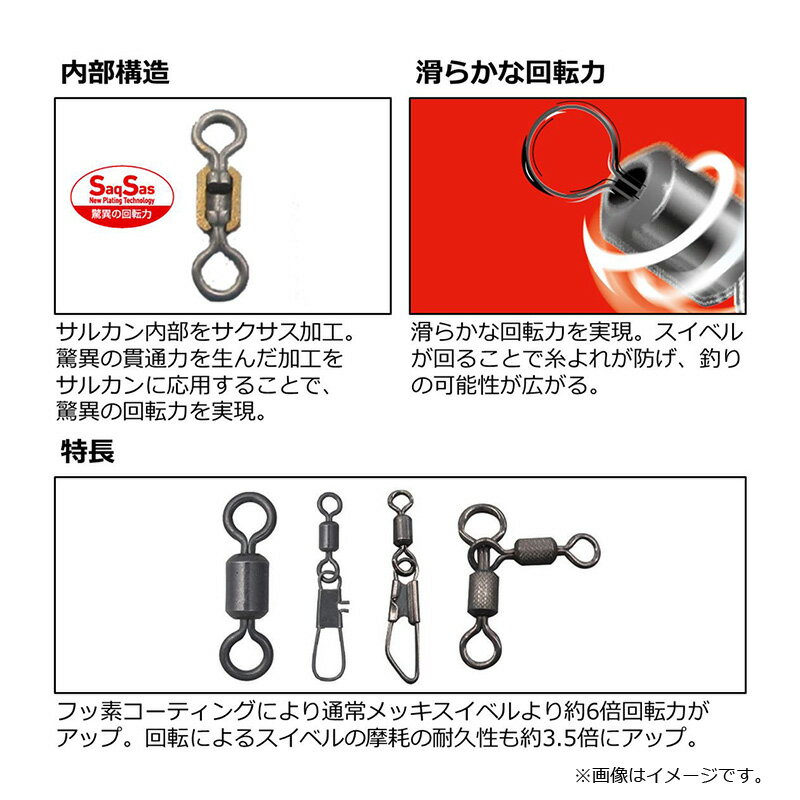 仕様表驚異の回転力・サクサススイベルスイベルにサクサスフックに搭載している「New Plating Technology」を採用。滑らかな回転力を実現。スイベルが回ることで糸よれが防げ、釣りの可能性が広がる。フッ素コーティングにより通常メッキスイベルより約6倍回転力がアップ。回転によるスイベルの摩耗の耐久性も約3.5倍にアップ!お買い得なお徳用もラインナップ。<ダイワテクノロジー>●サクサス スイベルサクサスフックで実績のある「New Plating Technology」をスイベルに採用したことにより、従来にない滑らかな回転力を実現しました。このコーティングにより通常メッキスイベルに比べ、約6倍の回転力を手に入れるとともに、回転によるスイベルの摩耗に対する耐久性も約3.5倍に向上します。<製品詳細>●内部構造スイベル内部までフッ素コーティングすることで従来のスイベルより回転がスムーズになった。DAIWA D SWIVEL SSダイワ Dスイベル SS●アイテム:ローリング●サイズ:3●入数:6●全長(mm):約18.4●強度(kg):60●標準自重(g):0.61詳細はこちら
