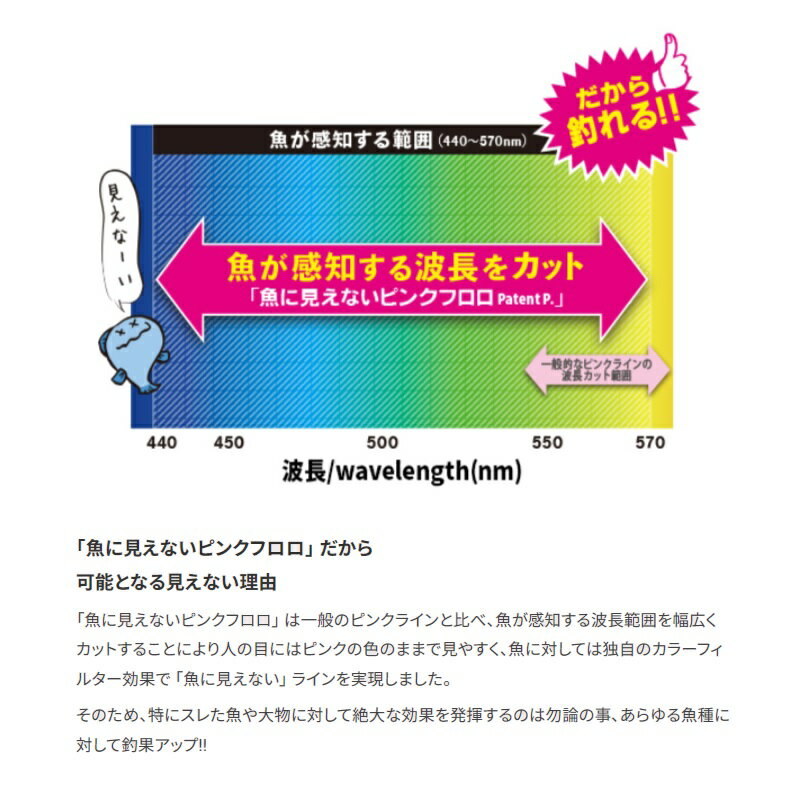 仕様表■高分子量フロロカーボン100%人に見やすく魚に見えない、あらゆる魚種の釣果アップ!!大物が釣れる!唯一の魚に見えないピンクフロロ Patent P.より大物に対応可能な50号〜120号を新たにラインナップ!!科学的な根拠と膨大な実釣検証により誕生したピンクフロロは、特殊配合による 「カラーフィルター効果 Patent P.」 で魚が感知する波長をカットし 「魚に見えない」 を実現。■人に見やすく魚に見えにくい 「ステルスピンク」 採用。一般的なピンクラインより幅広く 魚に見えない色相領域をカバー Patent P.■高分子量フロロカーボン原料を採用し、柔軟性があり粘り強い■独自のカラーフィルター効果魚は釣り糸を透過した光と反射された光が混ざった状態で視覚に捉え、色彩や明暗として認識しています。また、魚がラインをシルエットとしても認識していることを考えると、カラーフィルター効果と透明性を兼ね備えた性能であることが重要と考えられます。「魚に見えないピンクフロロ」 は、魚が感知する特定の範囲の波長を幅広くカット(吸収)するだけでなく、透明性も兼ね備えた独自のカラーフィルター機能搭載ラインです。■「魚に見えないピンクフロロ」 だから可能となる見えない理由「魚に見えないピンクフロロ」 は一般のピンクラインと比べ、魚が感知する波長範囲を幅広くカットすることにより人の目にはピンクの色のままで見やすく、魚に対しては独自のカラーフィルター効果で 「魚に見えない」 ラインを実現しました。そのため、特にスレた魚や大物に対して絶大な効果を発揮するのは勿論の事、あらゆる魚種に対して釣果アップ!!DUEL Pink Fluorocarbon FISH CANNOT SEEデュエル 魚に見えないピンクフロロ 漁業者・プロスペシャル●サイズ(号):10●標準強力(Lbs.):35●標準強力(kg):16●標準直径(mm):0.520●巻量(m):100●カラー:ステルスピンク詳細はこちら