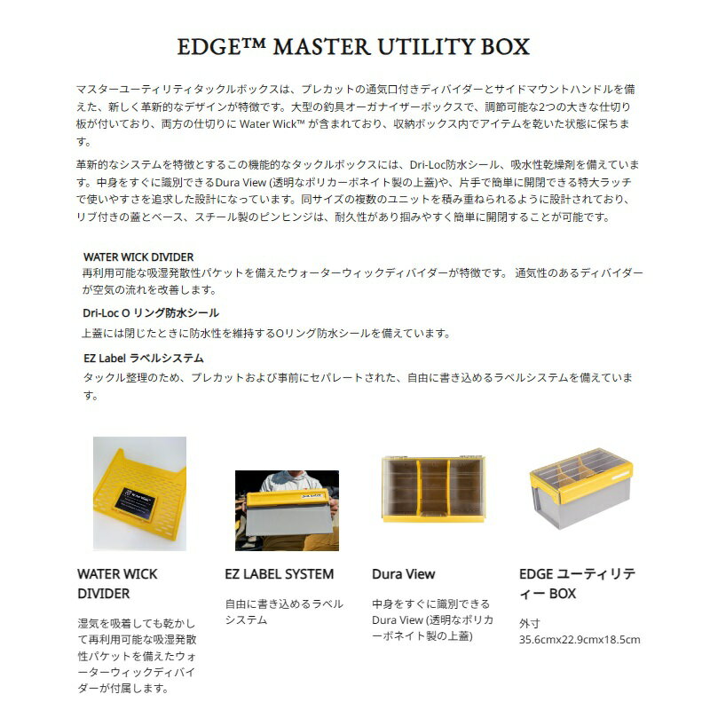 仕様表マスターユーティリティタックルボックスは、プレカットの通気口付きディバイダーとサイドマウントハンドルを備えた、新しく革新的なデザインが特徴です。大型の釣具オーガナイザーボックスで、調節可能な2つの大きな仕切り板が付いており、両方の仕切りに Water Wick が含まれており、収納ボックス内でアイテムを乾いた状態に保ちます。革新的なシステムを特徴とするこの機能的なタックルボックスには、Dri-Loc防水シール、吸水性乾燥剤を備えています。中身をすぐに識別できるDura View (透明なポリカーボネイト製の上蓋)や、片手で簡単に開閉できる特大ラッチで使いやすさを追求した設計になっています。同サイズの複数のユニットを積み重ねられるように設計されており、リブ付きの蓋とベース、スチール製のピンヒンジは、耐久性があり掴みやすく簡単に開閉することが可能です。●WATER WICK DIVIDER再利用可能な吸湿発散性パケットを備えたウォーターウィックディバイダーが特徴です。 通気性のあるディバイダーが空気の流れを改善します。●Dri-Loc O リング防水シール上蓋には閉じたときに防水性を維持するOリング防水シールを備えています。●EZ Label ラベルシステムタックル整理のため、プレカットおよび事前にセパレートされた、自由に書き込めるラベルシステムを備えています。PLANO EDGE UTILITY BOXプラノ EDGE ユーティリティー BOX●全長:35.6cm●幅:22.9cm●高さ:18.5cm●Style:3700 MASTER UTILITY●素材:本体プラスチック、上蓋ポリカーボネート●重量:1238g詳細はこちら