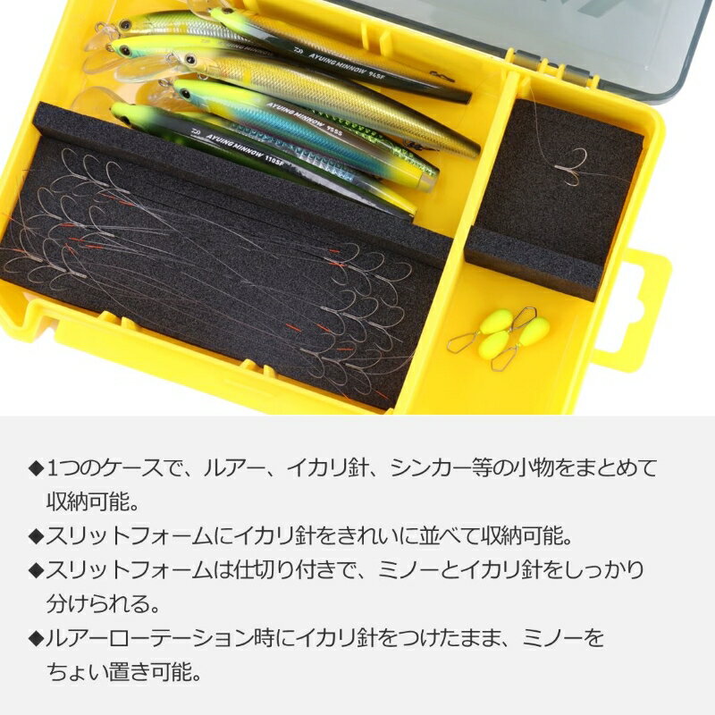 仕様表■ミノー、イカリ針、シンカー等をひとつに収納。1つのケースで、ミノーの交換もイカリ針、シンカーの取り付けを完結。スリットフォームにイカリ針をきれいに並べて収納可能。スリットフォームは仕切り付きで、ミノーとイカリ針をしっかり分けられる。ルアーローテーション時にイカリ針をつけたまま、ミノーをちょい置き可能。■針を付けたままルアーをちょい置き可能ルアーローテーション時に便利イカリ針をつけたまま、ミノーをちょい置き可能。■イカリ針、ミノー、シンカー等を並べて収納可能スリットフォームに仕切りがあり、分けて収納できる。針とミノーを分けて収納可能。■アユイングフックも収納可能DAIWA AYUING CASE 205Dダイワ アユイングケース 205D●外寸(cm):20.5×14.5×4.0●標準自重(kg):0.18●カラー:イエロー詳細はこちら