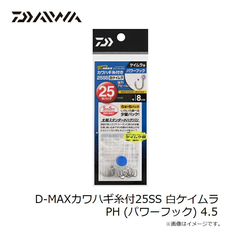 仕様表カワハギ糸付針に留め付シリーズが復活! パールホワイト+ケイムラで高アピール!カワハギ糸付針にケイムラ留がリバイバル!今回のケイムラ留は、パールホワイトをイメージした白色。前回のクリアケイムラからアピール力をさらにアップ。好奇心旺盛なカワハギに効果的。アピールに加えて、留めがある事により針が持ちやすくなり餌付け・針交換も行いやすい。針はスピード・パワースピード・パワーフック・ネオフックの4種類をご用意。【ダイワテクノロジー】■サクサス従来のメッキ処理では実現できなかった驚きの貫通力を持つ表面処理テクノロジー。ハリの表面にフッ素系特殊プレーティング加工を施すことで、刺さり性能は従来の塗装ハリに比べて最大40%(平均約20%)アップ(当社比)し、今まで合わせきれなかった小さなアタリやショートバイトも逃さずキャッチします。【製品詳細】■パールホワイトのケイムラ留■ローライトでもしっかりアピールDAIWA D-MAX KAWAHAGI ITO 25 SS WHITE KEIMURAダイワ D-MAXカワハギ糸付25SS 白ケイムラ●アイテム:PH4.5●サイズ:4.5●ハリス号数:2.5●ハリス長さ(cm):8●入数:25詳細はこちら