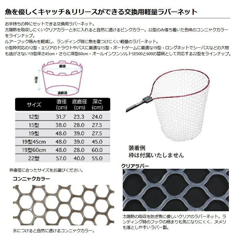 仕様表■魚を優しくキャッチ&リリースができる交換用軽量ラバーネットお手持ちの枠にセットできる交換用ラバーネット。太陽熱を吸収しにくいクリアカラーと水に入れると自然に透けるピンクカラー。22型のみ落ち着いた色味のコンニャクカラーをラインナップ。ルアーフック絡みを軽減し、ランディング時に魚を傷つけにくい軽量のラバーネット。小型枠対応の12型・エリアのトラウトやバスに最適な15型・ボートゲームに最適な19型・ロングネットでシーバスなどの大物も逃がさない19型深さ45cm・さらに深型60cm・オールインワンソルトSE500と600の替網として対応する22型をラインナップ。PROXプロックス 交換用ラバーランディングネット●サイズ:19型45cm●ネットカラー:クリアー●直径(cm):48●底直径(cm):39●深さ(cm):45●自重(g):340●材質:ラバー詳細はこちら