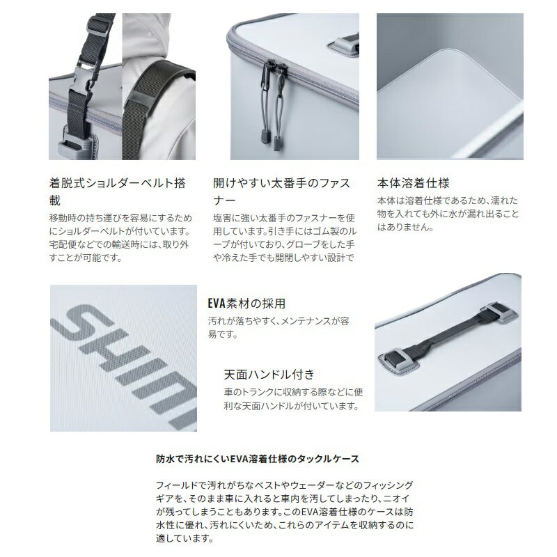 仕様表■防水で汚れにくいEVA溶着仕様のタックルケースフィールドで汚れがちなベストやウェーダーなどのフィッシングギアを、そのまま車に入れると車内を汚してしまったり、ニオイが残ってしまうこともあります。このEVA溶着仕様のケースは防水性に優れ、汚れにくいため、これらのアイテムを収納するのに適しています。■着脱式ショルダーベルト搭載移動時の持ち運びを容易にするためにショルダーベルトが付いています。宅配便などでの輸送時には、取り外すことが可能です。■開けやすい太番手のファスナー塩害に強い太番手のファスナーを使用しています。引き手にはゴム製のループが付いており、グローブをした手や冷えた手でも開閉しやすい設計です。■本体溶着仕様本体は溶着仕様であるため、濡れた物を入れても外に水が漏れ出ることはありません。■EVA素材の採用汚れが落ちやすく、メンテナンスが容易です。■天面ハンドル付き車のトランクに収納する際などに便利な天面ハンドルが付いています。SHIMANOシマノ BK-075X キャリーケース●サイズ:M●重量(kg):1.3●本体寸(cm):24×54×34●カーボン(%):ブラック詳細はこちら