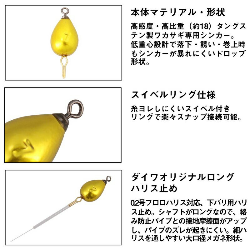 仕様表粉雪舞う季節。熱い想いとともに。雪の結晶をロゴにもつ「クリスティア」。そのターゲットはワカサギ。誰にも狙え、冬期に最も熱く盛り上がる。釣りは他のスポーツと違い、トッププレイヤー用にカスタマイズした道具を用いない。つまり、作り込まれたモデルは習熟度にかかわらず釣りの楽しさを引き出せることに繋がる。クリスティアはワカサギの楽しさを誰でも享受できることを根底にしながらも、DAIWAテスター陣のこだわりを具現化する。このこだわりは、エントリー者には使いやすく、習熟者には最高の武器になることだろう。雪の結晶を溶かすほどの熱量を、クリスティアとともに。高感度・高比重 タングステン製ワカサギ専用シンカー。低重心設計で落下・誘い・巻上時もシンカーが暴れにくい!■高感度・高比重(約18g)タングステン製ワカサギ専用シンカー■重心設計で落下・誘い・巻上時もしシンカーが暴れにくいドロップ形状■スイベルリング仕様糸ヨレしにくいスイベル付きリングで「楽々!スナップ接続可能」。■ダイワオリジナルロングハリス止め0.2号フロロハリス対応、下バリ用ハリス止め。シャフトがロングなので、絡み防止パイプとの接地摩擦面がアップし、パイプのズレが起きにくい。細ハリスを通しやすい大口径メガネ形状。■アピールの「ゴールド」カラーDAIWA CRYSTIA WAKASAGI SINKER TG2 DR-Rダイワ クリスティアワカサギシンカーTG2 DR-R●カラー:ゴールド●サイズ:3g●入 数:2詳細はこちら