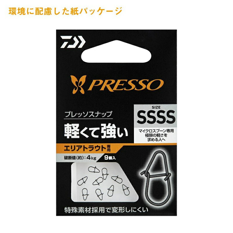 仕様表釣り方までもスタイリッシュになっていく。エリアフィッシングの攻略に必要なのは、自然のフィールドとは異なる独自の戦略と技術、そして専用のタックル。エリアフィッシング専用のスペシャルギアとして開発されたのは、イタリア語に語源を持つ『PRESSO』。PRESSOの開発の根底にあるもの。いかにスマートに、いかにクールに釣るか。その釣り方にまでこだわる美意識を集約させたデザインは、タックルをセットした瞬間から、強烈なアイデンティティとともに、アングラーのスイッチを入れる。プロダクトの追求が新しいスタイルまでも提案していく。手にしたあなた自身が、ムーブメントになる和田浩輝フィールドテスター開発協力。エリアトラウトに求められる要素を全てつぎ込んだ専用スナップ。形状はもちろん、素材の選定、表面処理などを一から見直したエリアトラウト専用設計のスナップ。トーナメントの最前線で戦う和田浩輝フィールドテスター開発協力のもと、使用感の追求とルアーの潜在能力を最大限活かす設計にこだわった。用途を限定したスペシャル設計もラインアップ。※使用上の注意 特殊素材採用のため、錆が発生することがございます。 使用後は水分を切り、乾燥した状態で保管してください。海水では使用しないでください。DAIWA PRESSO SNAPダイワ プレッソ スナップ●カラー:マットブラック●サイズ:SS●強 度:約9kg●入 数:9詳細はこちら