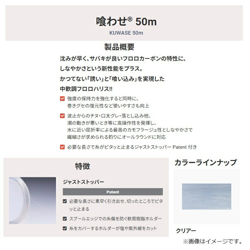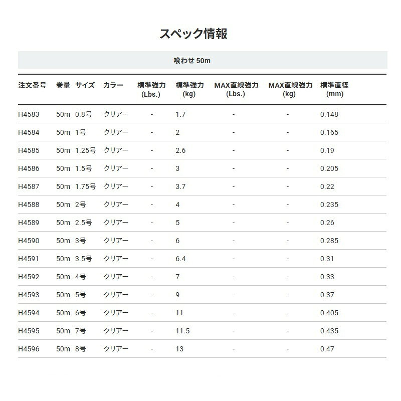仕様表沈みが早く、サバキが良いフロロカーボンの特性に、しなやかさという新性能をプラス。かつてない「誘い」と「喰い込み」を実現した中軟調フロロハリス!!■強度の保持力を強化すると同時に、巻きグセの復元性など使いやすさも向上■波止からのチヌ・口太グレ・落とし込み他、潮の動きが悪いとき等に高操作性を発揮し、 水に近い屈折率による最高のカモフラージュ性としなやかさで繊細さが求められる釣りに オールラウンドに対応■必要な長さで糸がピタッと止まるジャストストッパーPatent付き【特徴】■ジャストストッパー・必要な長さに素早く引き出せ、切ったところでピタッと止まる・スプールエッジでの糸傷を防ぐ軟質樹脂ホルダー・糸をカバーするホルダーが塩や紫外線をカットDUEL KUWASE 50mデュエル 喰わせ 50m●注文番号:H4584●巻量(m):50●サイズ(号):1●カラー:クリアー●標準強力(Lbs.):-●標準強力(kg):2●MAX直線強力(Lbs.):-●MAX直線強力(kg):-●標準直径(mm):0.165詳細はこちら