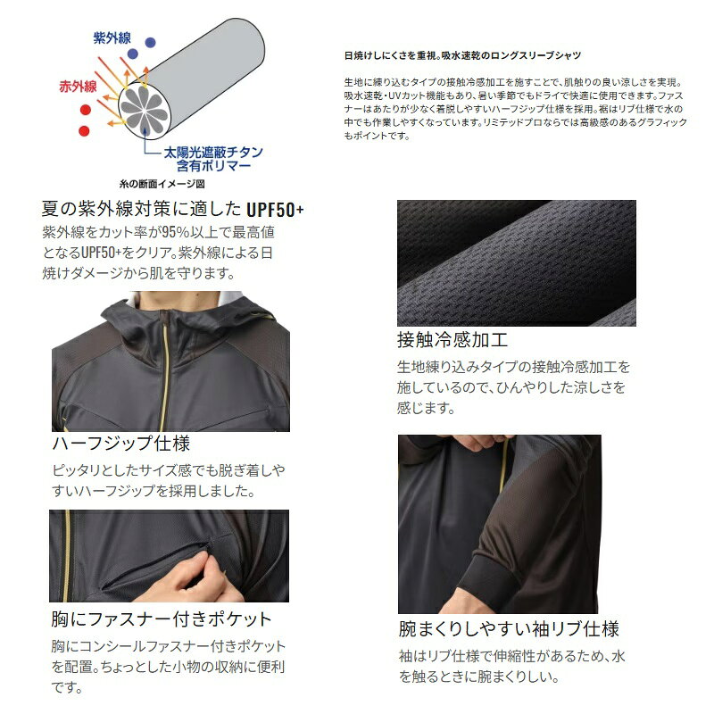 仕様表■日焼けしにくさを重視。吸水速乾のロングスリーブシャツ生地に練り込むタイプの接触冷感加工を施すことで、肌触りの良い涼しさを実現。吸水速乾・UVカット機能もあり、暑い季節でもドライで快適に使用できます。ファスナーはあたりが少なく着脱しやすいハーフジップ仕様を採用。裾はリブ仕様で水の中でも作業しやすくなっています。リミテッドプロならでは高級感のあるグラフィックもポイントです。■夏の紫外線対策に適したUPF50+紫外線をカット率が95%以上で最高値となるUPF50+をクリア。紫外線による日焼けダメージから肌を守ります。■接触冷感加工生地練り込みタイプの接触冷感加工を施しているので、ひんやりした涼しさを感じます。■ハーフジップ仕様ピッタリとしたサイズ感でも脱ぎ着しやすいハーフジップを採用しました。■腕まくりしやすい袖リブ仕様袖はリブ仕様で伸縮性があるため、水を触るときに腕まくりしい。I■胸にファスナー付きポケット胸にコンシールファスナー付きポケットを配置。ちょっとした小物の収納に便利です。SHIMANO SH-124Yシマノ SH-124Y リミテッドプロ ハーフジップフーディ ●品番:SH-124Y●サイズ:S●着丈(cm):66.5●身幅(cm):52●裾幅(cm):49●裄丈(cm):79.5●カラー:リミテッドホワイト詳細はこちら
