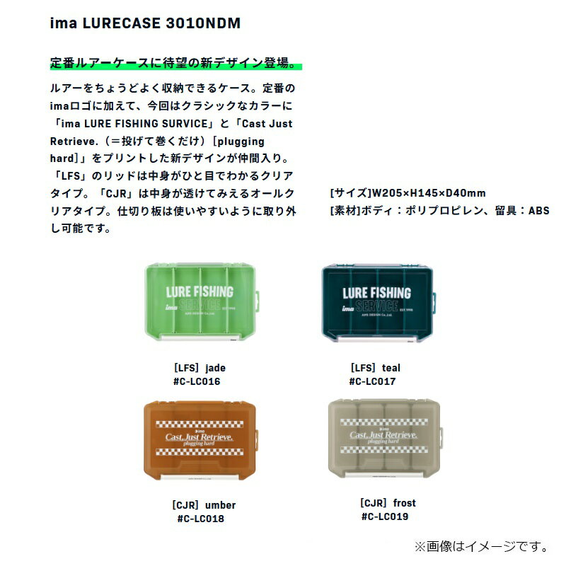 仕様表定番ルアーケースに待望の新デザイン登場。ルアーをちょうどよく収納できるケース。定番のimaロゴに加えて、今回はクラシックなカラーに「ima LURE FISHING SURVICE」と「Cast Just Retrieve.(=投げて巻くだけ)[plugging hard]」をプリントした新デザインが仲間入り。「LFS」のリッドは中身がひと目でわかるクリアタイプ。「CJR」は中身が透けてみえるオールクリアタイプ。仕切り板は使いやすいように取り外し可能です。AMS Design ima LURECASE 3010NDMアムズデザイン imaルアーケース 3010NDM●サイズ:W205×H145×D40mm●素材:ボディ:ポリプロピレン/留具:ABS●カラー:[CJR]frost #C-LC019詳細はこちら