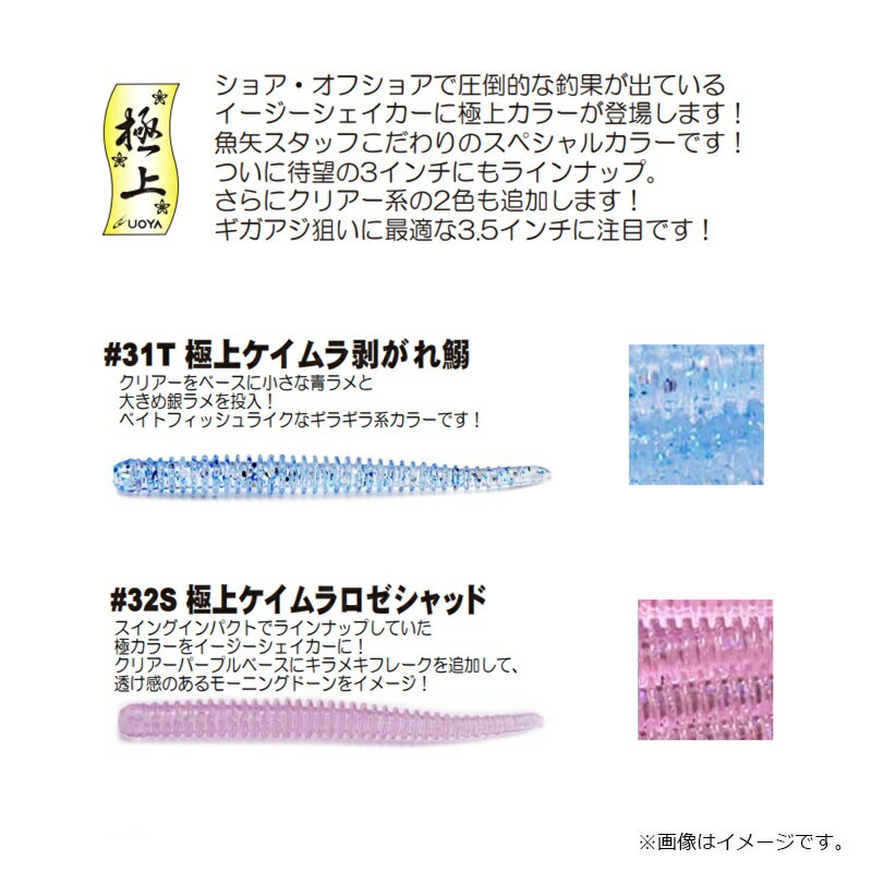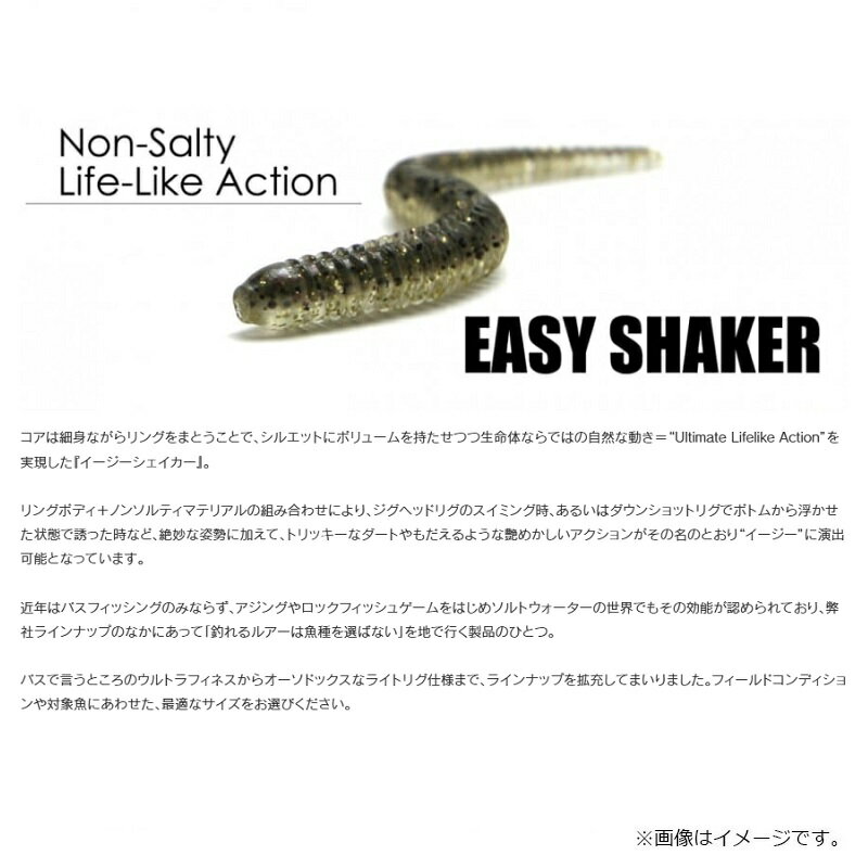 仕様表ケイテック イージーシェイカー極上カラーに新色が追加されます!近年各地で盛り上がりを見せているバチコンアジングにも最適な3インチが登場!さらにクリアー系のケイムラカラー2色も追加!コアは細身ながらリングをまとうことで、シルエットにボリュームを持たせつつ生命体ならではの自然な動き=「Ultimate Lifelike Action」実現した「イージーシェイカー」。 リングボディ+ノンソルティマテリアルの組み合わせにより、ジグヘッドリグのスイミング時、あるいはダウンショットリグでボトムから浮かせた状態で誘った時など、絶妙な姿勢に加えて、トリッキーなダートやもだえるような艶めかしいアクションがその名のとおり「イージー」に演出可能となっています。 近年はバスフィッシングのみならず、アジングやロックフィッシュゲームをはじめソルトウォーターの世界でもその効能が認められており、弊社ラインナップのなかにあって「釣れるルアーは魚種を選ばない」を地で行く製品のひとつ。 バスで言うところのウルトラフィネスからオーソドックスなライトリグ仕様まで、ラインナップを拡充してまいりました。フィールドコンディションや対象魚にあわせた、最適なサイズをお選びください。【Detail】■デザインほぼ全身リング状のリブでシルエットを太く見せつつ、細いコアボディによりしなやかに動くデザイン。ワーム頭部〜胸部をやや太めにデザインしオフセットフックを刺しやすく、背と腹には繊細なスリットを施すことで、オフセットフックの針先がリブの間に隠れ、根掛かりを軽減します。■水平姿勢ノンソルティー素材を採用することで、ダウンショットリグで使用した際にマスバリでの使用はもちろん、オフセットフック使用時においても安定した水平姿勢を崩さず魚を誘い続けます。■透明感ノンソルティー素材ならではの、色鮮やかで透明感のあるカラーラインナップ。【#32S 極上ケイムラロゼシャッド】スイングインパクトでラインナップしていた極カラーをイージーシェイカーに!クリアーパープルベースにキラメキフレークを追加して、透け感のあるモーニングドーンをイメージ!KEITECH EASY SHAKERケイテック イージーシェイカー●サイズ:2.5インチ●重 量:約0.7g●入り数:14尾入り/パック●カラー:#32S 極上ケイムラロゼシャッド詳細はこちら