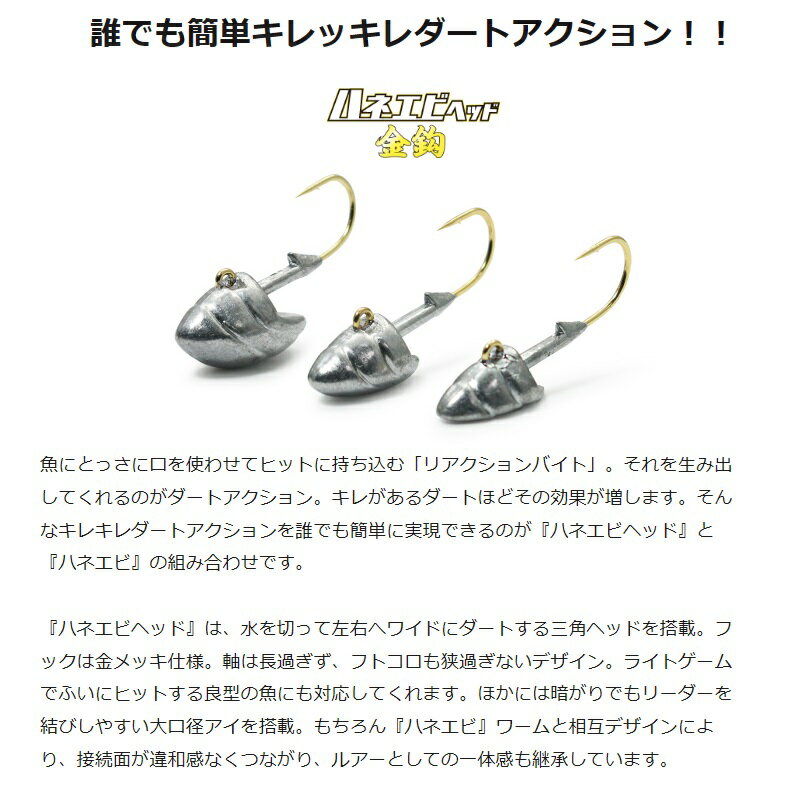 仕様表■誰でも簡単キレッキレダートアクション!!魚にとっさに口を使わせてヒットに持ち込む「リアクションバイト」。それを生み出してくれるのがダートアクション。キレがあるダートほどその効果が増します。そんなキレキレダートアクションを誰でも簡単に実現できるのが『ハネエビヘッド』と『ハネエビ』の組み合わせです。『ハネエビヘッド』は、水を切って左右へワイドにダートする三角ヘッドを搭載。フックは金メッキ仕様。軸は長過ぎず、フトコロも狭過ぎないデザイン。ライトゲームでふいにヒットする良型の魚にも対応してくれます。ほかには暗がりでもリーダーを結びしやすい大口径アイを搭載。もちろん『ハネエビ』ワームと相互デザインにより、接続面が違和感なくつながり、ルアーとしての一体感も継承しています。■オリジナルジグフック金メッキフック仕様。長過ぎず、狭過ぎないフックデザイン。暗がりでも作業しやすい大口径アイ。海太郎 ハネエビヘッド 金鈎 + ハネエビISSEI一誠 海太郎 ハネエビヘッド 金鈎●サイズ:3g●フック:#8●入数:4詳細はこちら