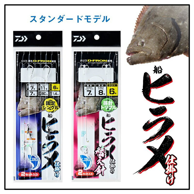 仕様表ダイワ船ヒラメ仕掛けのスタンダードモデルのリニューアル版シンプルイズベストをコンセプトに基本性能を一から見直したダイワの次世代スタンダード船ヒラメ仕掛けが「船ヒラメ仕掛け LBG」。こだわりの針仕様親針・・・D-MAXヒラメライト(シングル・トリプル共に)エサが刺しやすくフッキング率を高めた『ヒネリ無しストレート形状』ポイント。軽さとフッキング率が高い『チヌ針形状』。孫針:D-MAXヒラメパワー(シングル)ヒラメ針の鉄板である伊勢尼形状。太軸形状なので不意の大物にも安心。孫針:D-MAXヒラメトリプル(トリプル)針先は掛かり重視のストレートポイント。エサ付けしやすい『ワイドゲイプ形状』。ラインナップ:4シリーズシングルタイプ:3サイズ展開(ハリス6〜8号)トリプルタイプ:3サイズ展開(ハリス6〜8号)シングル替え針タイプ:3サイズ展開(ハリス6〜8号)トリプル替え針タイプ:3サイズ展開(ハリス6〜8号)【製品詳細】■チモト枕結び親針のチモトを枕結びにすることにより、針掛かりが向上。またハリスがタタキ部分に干渉しにくくなりハリス切れを軽減。■深海結びシンプルな結び方だが、結束強度にバラつきがすくなく安心の強度を誇る。■編み込み結び(ハリス結束部分)■オールフロロカーボン(Dフロン船ハリス)しなやかでコシがあり、ヨレにも強く、感度、結束強度もアップ。■外掛け結び(孫針トリプル仕様)孫針のトリプルフックには「外掛け結び」を採用することで強度が安定し、ハリスと針が常に張る仕様になる為に掛かりが向上。DAIWA FUNE HIRAME SHIKAKE LBGダイワ 船ヒラメ仕掛け LBG●アイテム:LBG 固定トリプル7/8-7●サイズ:7/8-7●フック(針)サイズ:7/8●ハリス号数:7●幹糸(号):8●ハリス長さ(cm):80●フックタイプ:トリプル●入数:2●幹糸長さ(cm):90●全長(cm):140●捨て糸(号):4詳細はこちら