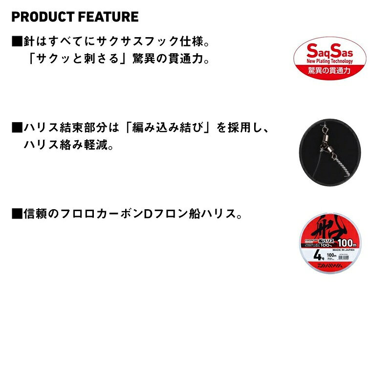 仕様表元祖サクサス仕様ヒラメ仕掛けの復刻版が遂に登場!!・2015年リリースの快適ヒラメ仕掛SS 東北チラシの復刻版仕掛け・針はすべてにサクサスフック仕様「サクッと刺さる」驚異の貫通力!!・ハリス結束部分は「編み込み結び」を採用し、ハリス絡み軽減・チラシ2本(5/4-5,6/4-5)、チラシ3本(6/4-5,6/5-6)の4ラインアップ(ダイワテクノロジー)従来のメッキ処理では実現できなかった驚きの貫通力を持つ表面処理テクノロジー。ハリの表面にフッ素系特殊プレーティング加工を施すことで、刺さり性能は従来の塗装ハリに比べて最大40%(平均約20%)アップ(当社比)し、今まで合わせきれなかった小さなアタリやショートバイトも逃さずキャッチします。DAIWA FUNE HIRAME SHIKAKE SS TOUHOKUCHIRASHI LBGダイワ 船ヒラメ仕掛けSS 東北チラシ LBG●品名:船ヒラメ仕掛けSS 東北チラシ LBG 2本6/4-5●サイズ:6/4-5●フック(針)サイズ:6/4●ハリス号数:5●幹糸(号):7●ハリス長さ(cm):80●フックタイプ:シングル●入数:2●幹糸長さ(cm):100●全長(cm):140詳細はこちら