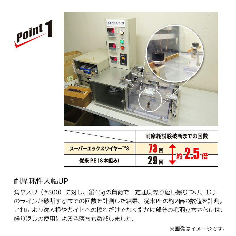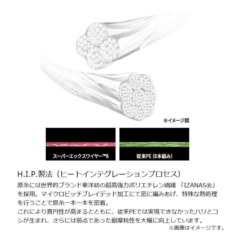 仕様表スーパーエックスワイヤーに「エギング専用」新登場!高視認×高感度×高操作性●「H.I.P(ヒートインテグレーションプロセス)製法」にて原糸同士の密着度を高め、糸に絶妙なハリとコシを実現。ガイド絡み等のトラブルを軽減すると同時に、耐久性アップ。●真円性が高く、摩擦抵抗を軽減することで、キャスト時に空気抵抗が減少し、飛距離がアップ。さらに、水切れが良くなることで操作性が向上。●エギングに要求される操作性、感度を備えた一つ上のハイパフォーマンスライン。※真円性が高い為、リールに表記された糸巻量が若干巻けない場合があります。<特徴>●H.I.P.製法(ヒートインテグレーションプロセス)原糸には世界的ブランド東洋紡の超高強力ポリエチレン繊維「IZANAS」を採用。マイクロピッチブレイデッド加工にて密に編みあげ、特殊な熱処理を行うことで原糸一本一本を密着。これにより真円性が高まるとともに、従来PEでは実現できなかったハリとコシが生まれ、さらには弱点であった耐摩耗性を大幅に向上しています。●耐摩耗性大幅UP角ヤスリ(#800)に対し、鉛45gの負荷で一定速度繰り返し擦りつけ、1号のラインが破断するまでの回数を計測した結果、従来PEの約2倍の数値を計測。これにより沈み根やガイドへの擦れだけでなく指かけ部分の毛羽立ちさらには、繰り返しの使用による色落ちも激減しました。●真円性の向上一本一本の原糸が密着しているのでキャスト時の抵抗が軽減し飛距離がUP!!さらにガイドとの摩擦による糸鳴りを抑制。●適度なハリとコシハリがあるのでキャスト時のトラブルが激減。水ギレが良く、エギをより自然に沈下させることができ、ラインの糸フケによるシャクリ抵抗を極力少なくすることが可能になりました。●感度UP!!&操作性大幅UP!!100mに1kgの負荷を加えた伸びは従来のPE86.3cmに対しスーパーエックスワイヤーは44.4cm!!約2倍の伸度減で感度大幅UP!!ダイレクトな操作性でルアー本来の性能を100%引き出します。<カラーラインナップ>●WPM ホワイトピンクマーキング色落ち激減!高視認マーキングラインDUEL Super X-wire 8 EGINGデュエル スーパーエックスワイヤー8 エギング●品 番:H4631-●巻 量:200m●サイズ:0.4号●カラー:WPM●標準強力(Lbs.):8.5●標準強力(kg):3.9●標準直径(mm):0.11●ライン比重:0.97詳細はこちら