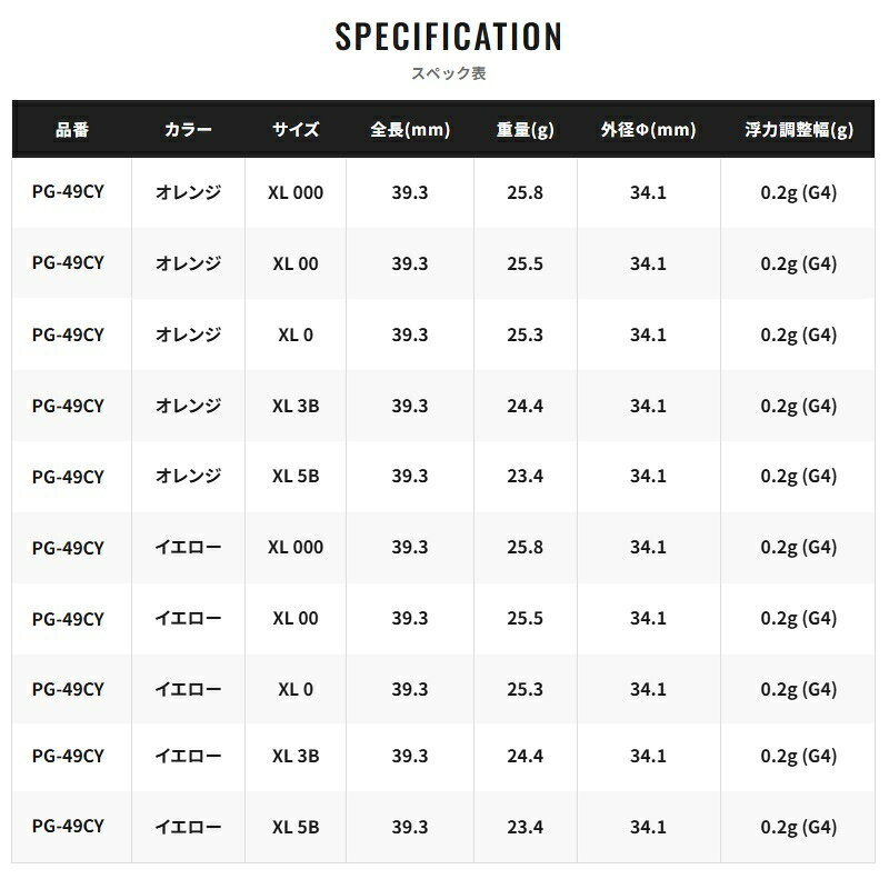 仕様表全遊動の定番ウキにXLサイズが登場。ウキのアンカー効果を最大限高めるには、どっしりした下膨れ形状のTYPE-Dシリーズのフォルムを継承しつつ大型化するのが圧倒的に有利。強風や上潮の影響で道糸が引っ張られ、マキエとの同調がきわめて困難な状況でも、自重があって潮をしっかりつかめるXLサイズなら、道糸の抵抗をものともせず流したいコースからウキがずれにくい。条件が厳しくなるほど発揮されるその威力は、フカセ釣り師の対応幅を広げるあらたな一手となる。SHIMANO PG-49CY ZRO PIT DVC TYPE-D XLシマノ PG-49CY ゼロピット DVC TYPE-D XL●品 番:PG-49CY●カラー:イエロー●サイズ:XL 3B●全 長:39.3mm●重 量:24.4g●外 径Φ:34.1mm●浮力調整幅:0.2g(G4)●素 材:ABS詳細はこちら