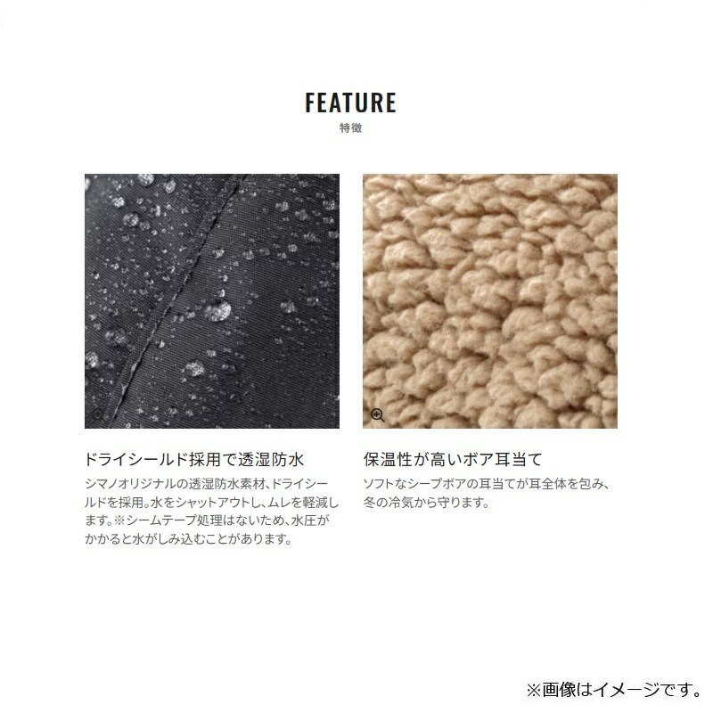 仕様表防水透湿性を備えた、耳当て付きボアキャップ冷気から耳を守る保温性の高い耳当てが付いたボアキャップです。防水透湿性を備えた生地を使用しており、雨や雪に強く、快適な被り心地を実現しました。耳当て部分にはソフトなシープボアを採用し、高い保温性を確保しています。顎部分には薄型ワンタッチバックルの調整ベルトを採用しており、フィット感を調整することができます。(特徴)・ドライシールド採用で透湿防水シマノオリジナルの透湿防水素材、ドライシールドを採用。水をシャットアウトし、ムレを軽減します。※シームテープ処理はないため、水圧がかかると水がしみ込むことがあります。・保温性が高いボア耳当てソフトなシープボアの耳当てが耳全体を包み、冬の冷気から守ります。SHIMANOシマノ CA-072Y ボアキャップ●品番:CA-072Y●カラー:ブラック●サイズ:L●素材/表:ナイロン100% (ポリウレタン透湿防風加工) 裏:ポリエステル100%詳細はこちら