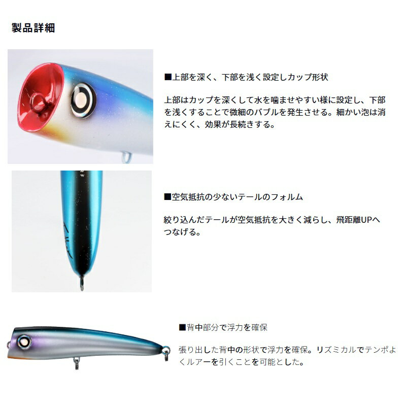 仕様表BREAK YOUR RECORD -夢を掴み獲れ-「いつか、あの魚を。」アングラーの夢を叶えるために誕生したもの、「SALTIGA」。DAIWAオフショア最強の遺伝子を受け継ぎ、最新のテクノロジーで進化し続ける。前提は、未知の大物との対峙。タックルとしての限界に挑み続け、あらゆる箇所の強度、使いやすく優位になる性能を追求する。ソルティガが課せられているのは、確実に夢の魚へと近づくタックルであるということ。その存在意義をかなえ続けることは、すなわちアングラーの夢がかなうこと。その信頼の性能は、世界中のアングラーの夢をサポートする。魅惑サウンド×超バブル。湧き上がる熱狂を。ソルティガフロッサーはきめ細やかな泡を纏い、魅惑のポップサウンドを奏でながら水中の魚を魅了するポッパーである。カップ上部は泡を噛みやすい様、深めに設定し、下部は浅くし、泡をたてられるような形状とした。それにより、リトリーブ時に深く潜りすぎず、水面直下を細かな泡と共に泳ぐ。また、ポッパーは高浮力タイプが多く、浮力を保つために沢山のウエイトを積めないが、ソルティガフロッサーはギリギリまでウエイトを積み、また、横風を受けた時にバランスを崩しにくいフォルムで飛行姿勢を安定させ、飛距離のアドバンテージを確保した。水中での浮き姿勢は垂直浮きで、一回目のジャークで潜りすぎず、レスポンスもよくなる。直線的でレスポンスの良いポッパーなので、リズミカルにテンポよく、まるでダイビングペンシルを扱えるポッパーである。- ダイワテクノロジー -レーザーインパクトレーザーインパクトは、3Dマルチ反射構造により「イワシ」等と同様の高輝度反射光を多方向に放ち、「本物の誘いを遠くまで」を実現。更に、泳いでいる時の反射光の明滅まで再現。夜間や日陰のわずかな光でもベイトフィッシュと同様、昼夜・場所を問わず光でターゲットにアピール。DAIWA SALTIGA FROTHERダイワ ソルティガ フロッサー●アイテム:200F●カラー:ケイムライワシ●サイズ:200mm●標準自重:ノーマル:95g LI:98g●リング重量:約2.2g●全体重量:ノーマル:約97.2g LI:約100.2g●タイプ:ポッパー●標準装備リング:#8●推奨フック/フックサイズ:トレブル #4/0〜5/0 シングル #7/0〜9/0詳細はこちら