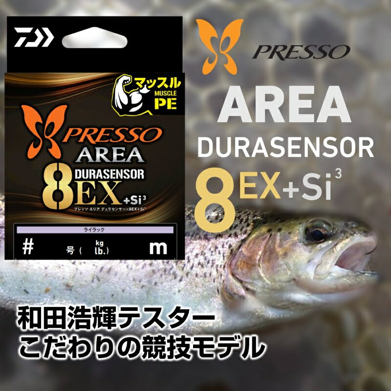 仕様表■釣り方までもスタイリッシュになっていく。エリアフィッシングの攻略に必要なのは、自然のフィールドとは異なる独自の戦略と技術、そして専用のタックル。エリアフィッシング専用のスペシャルギアとして開発されたのは、イタリア語に語源を持つ『PRESSO』。PRESSOの開発の根底にあるもの。いかにスマートに、いかにクールに釣るか。その釣り方にまでこだわる美意識を集約させたデザインは、タックルをセットした瞬間から、強烈なアイデンティティとともに、アングラーのスイッチを入れる。プロダクトの追求が新しいスタイルまでも提案していく。手にしたあなた自身が、ムーブメントになる。■和田テスターこだわりの競技モデル!ハイスペック8ブレイド極細PEライン!和田テスターこだわりの競技モデル。トーナメントで1匹でも多くキャッチするため、細部にこだわり設計。ハイスペック8ブレイドPE。糸表面が非常に滑らかで別次元の使用感。EX加工で糸表面が滑らかに。飛距離UP/音鳴り減少/ゴミ付着減少/毛羽立ち難い。+Si3加工でコスレに強く、耐久性UP。こだわりの180m巻。タックル・好みに合わせた長さでの使用が可能。※リールへの巻取り時は、マーキングによる換算か、リールの「ハンドル1回転の巻取長」×「回転数」の概算でご利用ください。例:EXIST LT2000S-P「1回転64cm」×「94回転」=およそ「60m」 カラー:ライラック+オレンジマーキング■マッスルPEDURAセンサーの中でも特に密に編み込まれたPEラインUVF/TOUGH PE/ EvoSilicone2、EvoSilicone3/マッスルBraidingの4つのテクノロジーからなる高密度PEこすれに強く、耐久性向上、音鳴り軽減、飛距離アップでトラブルレスといった特徴を持ちます。■TOUGH PE原糸1本1本が従来原糸よりも太く真円になった新原糸を使用し、強力・耐摩耗性・耐久性の向上を実現しました。この原糸をより合わせた1本をさらに4本・8本・12本のブレイド化しました。■EvoSilicone3(+Si3)ダイワ独自の特殊シリコン加工「+Si」「+Si2」が更にパワーアップしました。耐摩耗性と耐久性が「+Si2」のおよそ1.3倍。より滑らかで擦れに強くなっています。■UVF(Ultra Volume Fiber)繊維を凝縮しながらブレイドするDAIWA独自の加工方法であり、耐摩耗性の高さと強さが特長です。■マッスルBraiding密に編む込むことでショック切れに強く、トラブルを軽減します。DAIWA UVF PRESSO AREA DURA SENSOR X8EX+SI3ダイワ UVFプレッソエリアデュラセンサーX8EX+Si3●強力(lb):8.5●強力(kg):3.9●号数:0.4●巻糸量(m):180●素材:PE●ブレイド数:8詳細はこちら