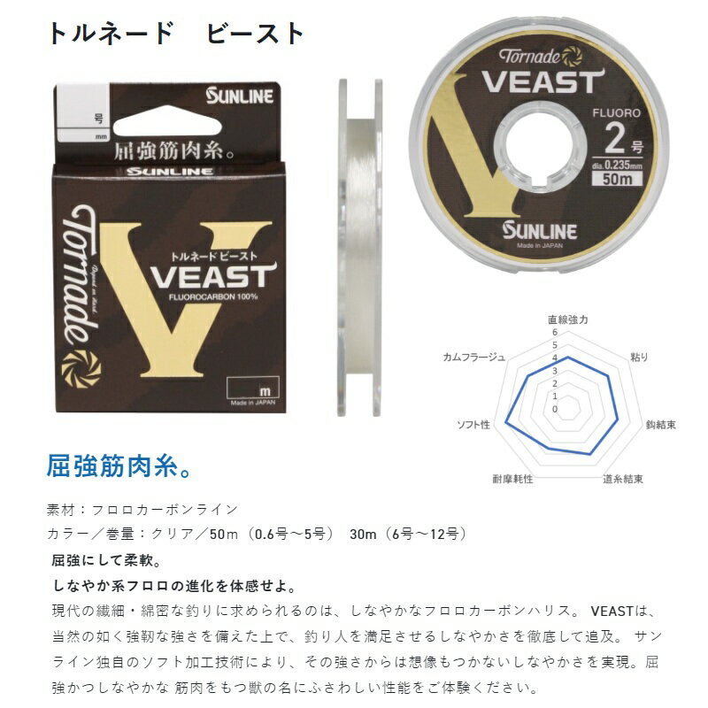仕様表■屈強筋肉糸。屈強にして柔軟。しなやか系フロロの進化を体感せよ。現代の繊細・綿密な釣りに求められるのは、しなやかなフロロカーボンハリス。 VEASTは、当然の如く強靭な強さを備えた上で、釣り人を満足させるしなやかさを徹底して追及。 サンライン独自のソフト加工技術により、その強さからは想像もつかないしなやかさを実現。屈強かつしなやかな 筋肉をもつ獣の名にふさわしい性能をご体験ください。SUNLINEサンライン 1046 トルネード ビースト●号数:1.755●標準直径(mm):0.220●素材:フロロカーボンライン●全長:50m●カラー:クリア詳細はこちら