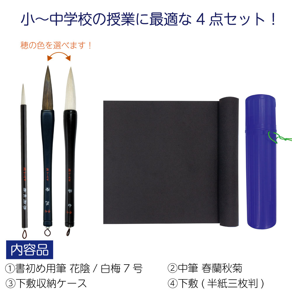 【名入れあり】あかしや 書初めセット 入門セット 良質の原毛をふんだんに使用した高級筆です。 墨含みがよく、コシが強く、穂先がよくまとまるため、基本点画が正しく美しく表現できます。 4〜5文字の条幅作品にお勧めです。 【内容品】 書初め用筆 7号 花陰(茶毛)または白梅(白毛) 中鋒 主原毛:馬毛、羊毛 名前書き用中筆 6号 春蘭秋菊 中鋒 主原毛:羊毛、馬毛 下敷 黒 半紙三枚判 下敷収納ケース 三枚判 青 水書用紙(購入特典) 書写楽ふきん(購入特典) 【商品サイズ】 書初め用筆:22径×253mm 中筆:9径×217mm 下敷:290×1100×1mm 下敷収納ケース:79径×330mm 注意点:お使いのモニターの発色具合によって、実際のものと色が異なる場合がございます。 メーカー希望小売価格はメーカーカタログに基づいて掲載していますこちらは「名入れあり」の商品です。 「名入れなし」をご希望の方はこちら→